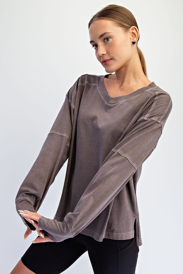 Yuri Pigment Washed Cotton V-Neck Top • Mocha