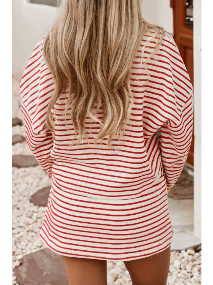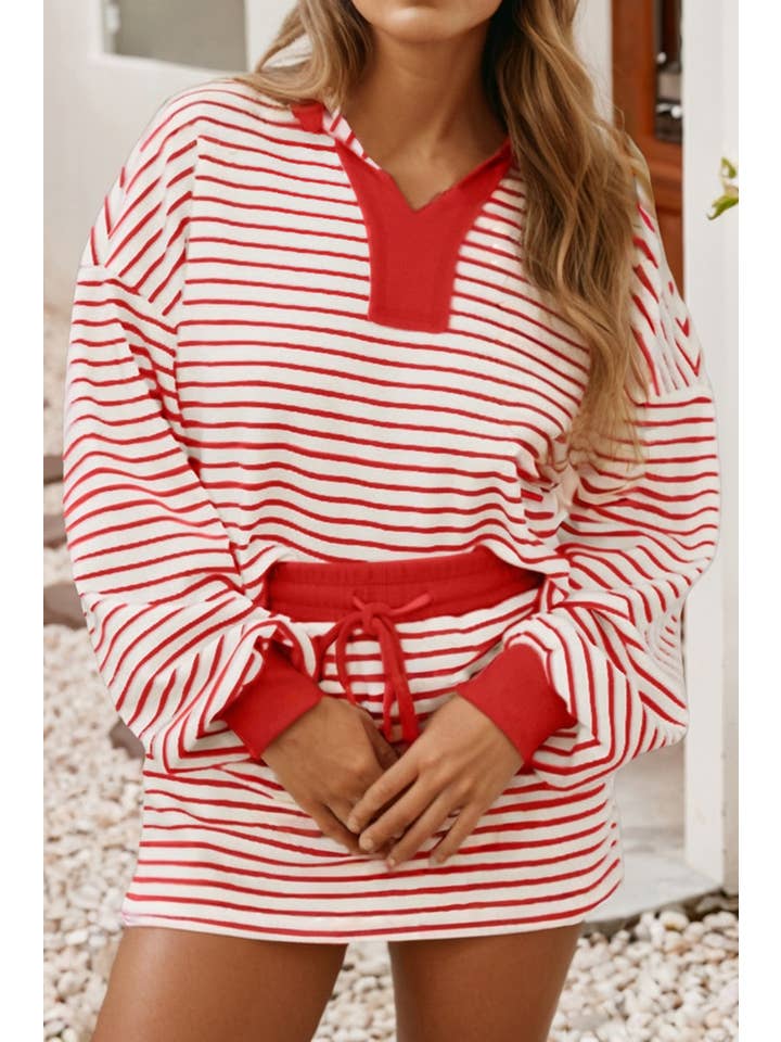 This playful striped pullover paired with a lace-up skirt creates a perfectly stylish duo. The collared V-neck adds a touch of sophistication, making it easy to dress up or down. Effortless to wear, this two-piece set is your go-to for fun days or special outings.