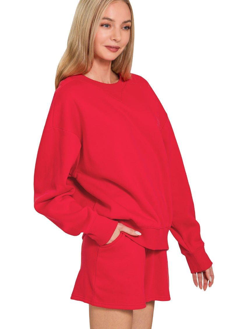 Stay cozy and cool with the Set It Up Sweatshirt and Shorts Set in Red. This playful duo features a soft fleece long sleeve sweatshirt paired with elastic waistband shorts that include handy side pockets—perfect for keeping essentials close. Whether lounging at home or stepping out, this set offers comfort and style with a fun, relaxed vibe.