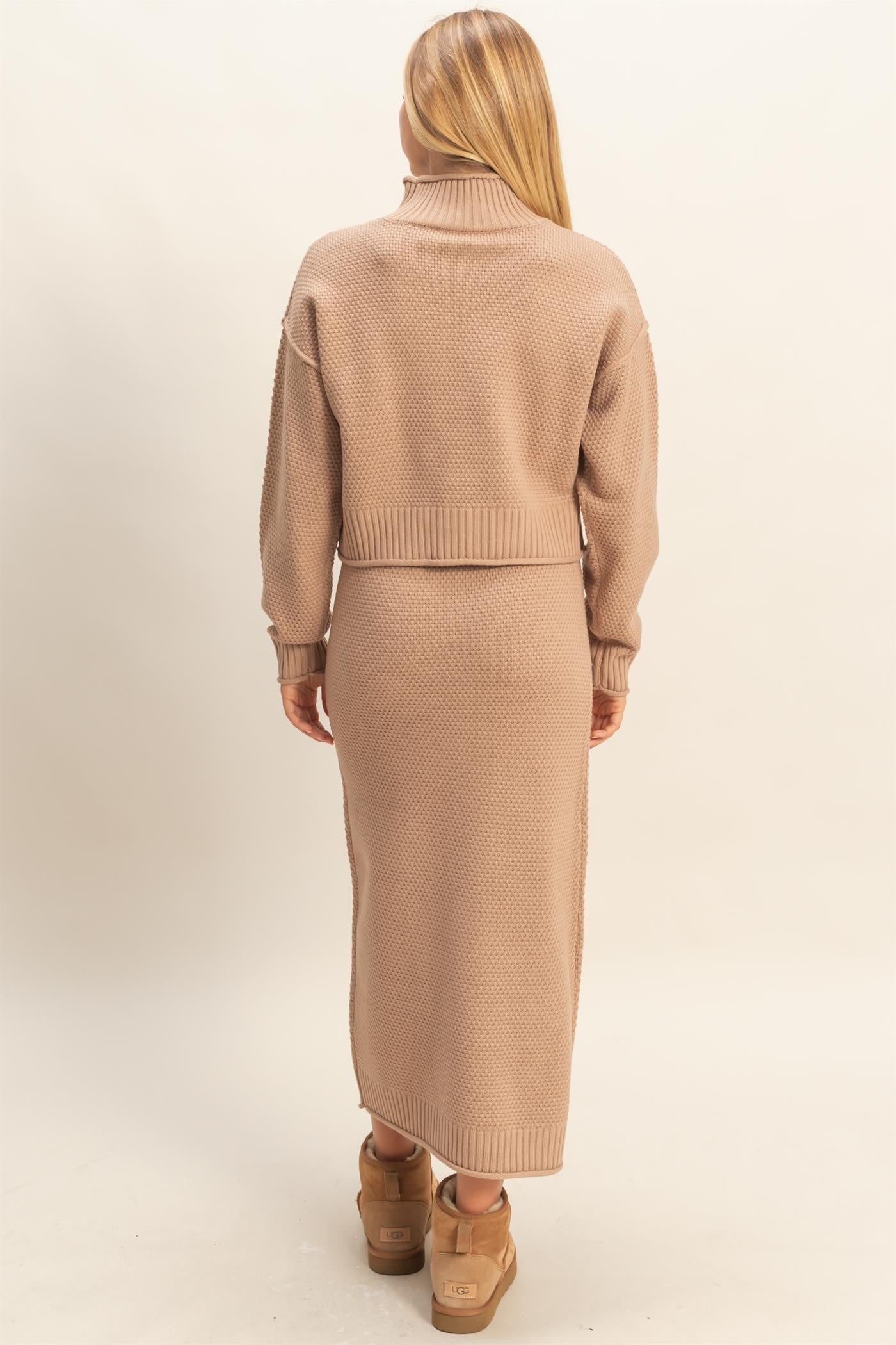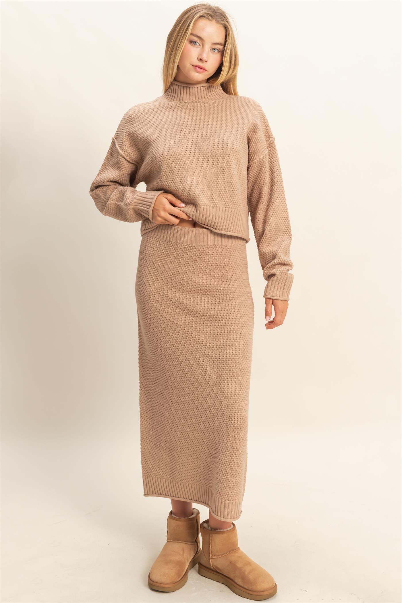 Fall into cozy chic with the Stevie Sweater & Skirt Set in dark taupe. This duo pairs a textured high neck sweater with a comfy long skirt, perfect for layering on breezy days or casual nights. Its relaxed fit lets you move freely while keeping things stylish. Dress it up with simple jewelry and loafers for a look that’s ready to impress from your 9-to-5 to weekend hangs. Who said comfort can't be runway-worthy?