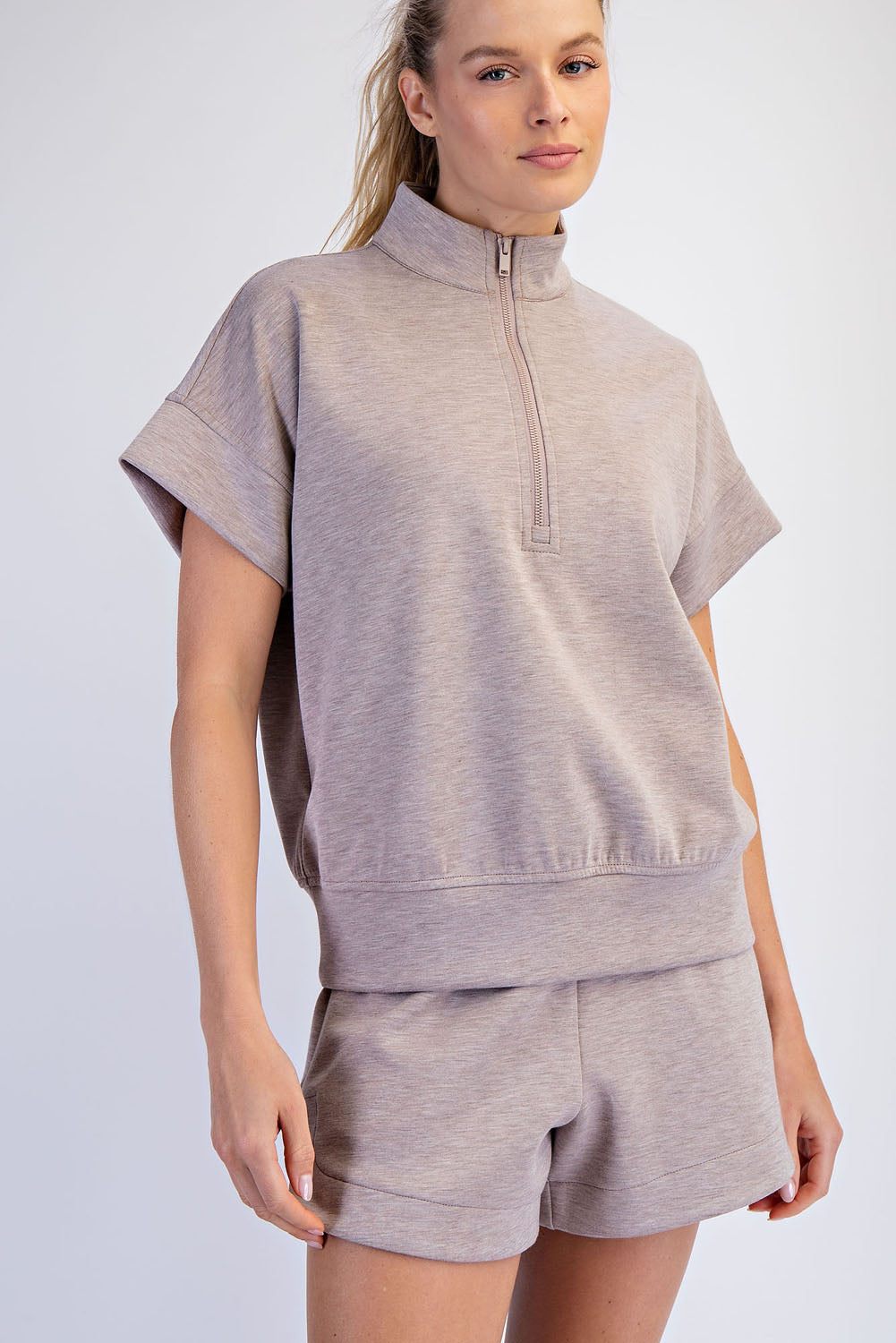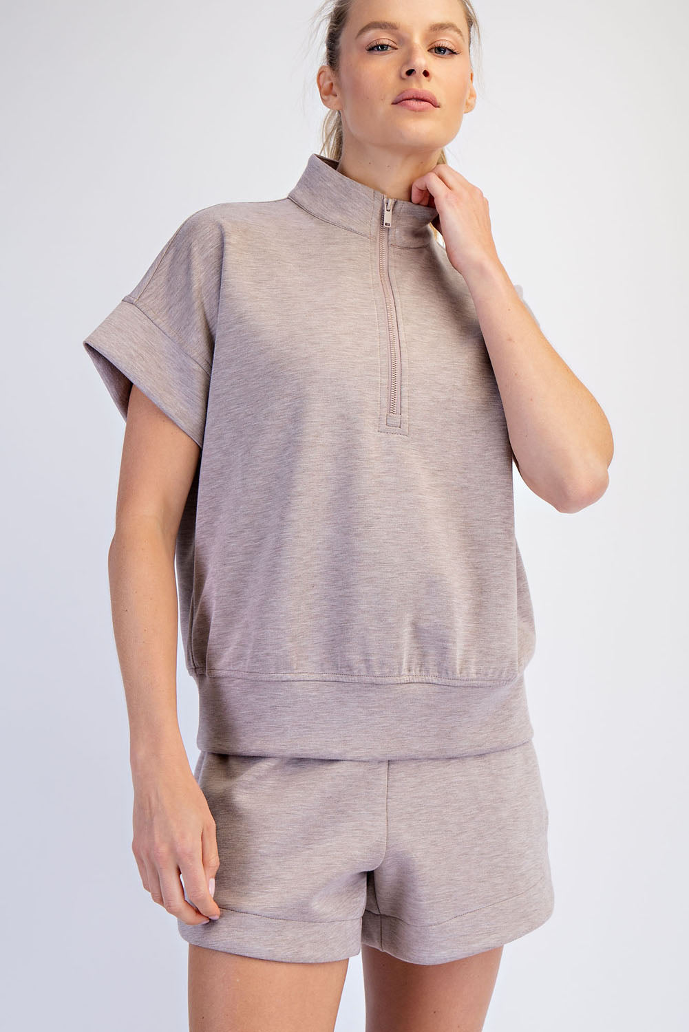 Cloud Soft Quarter Zip Short Sleeve Top • Heather Taupe