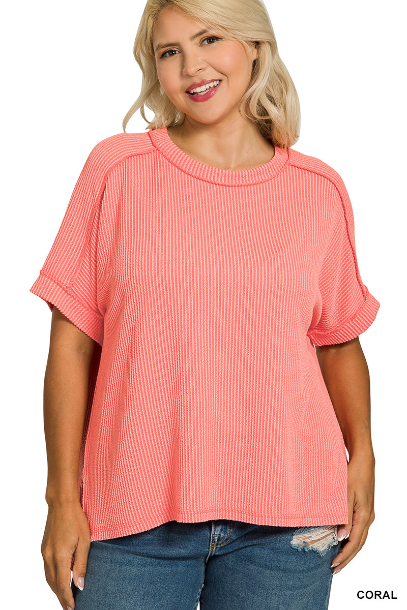 Enya Plus Ribbed Cuff Raw Edge Top • Coral