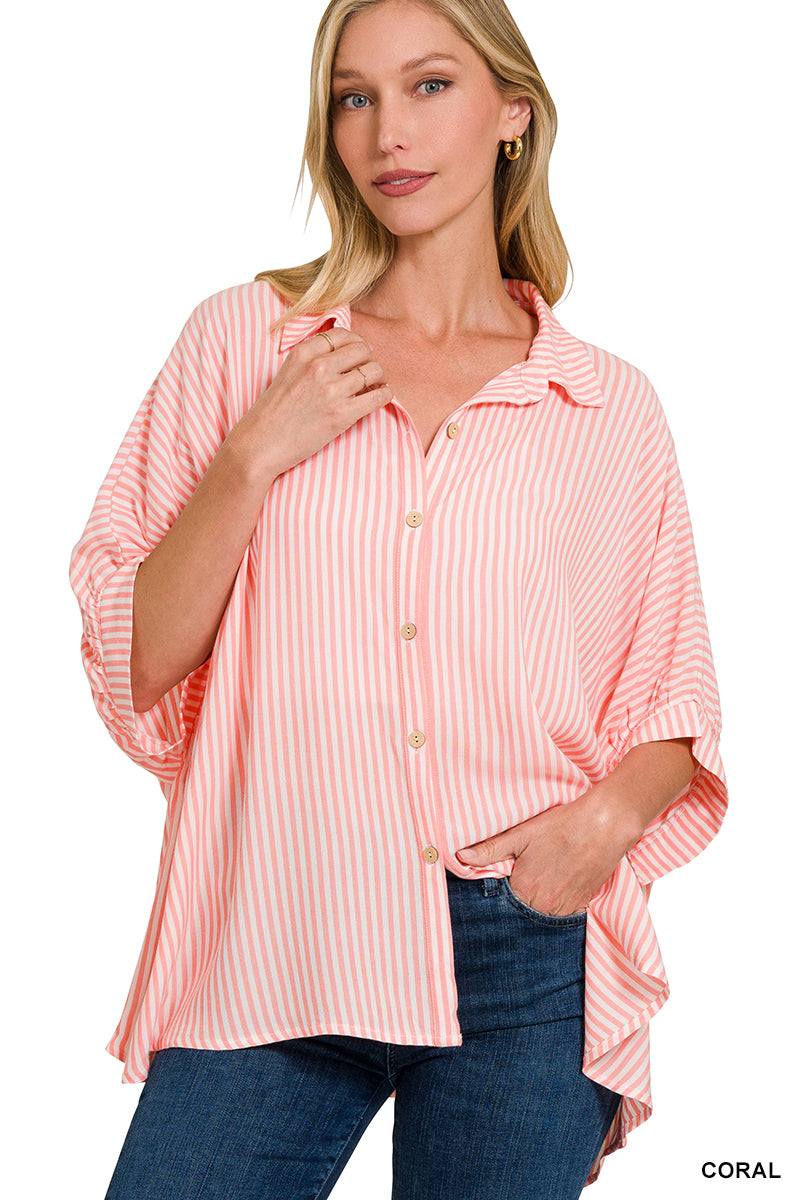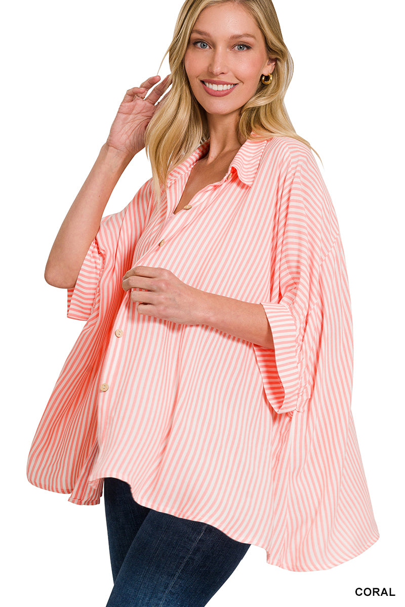 Effortlessly chic and comfortable, this oversized striped button-up shirt features a relaxed silhouette perfect for layering or wearing solo. Crafted from breathable 100% rayon, it drapes beautifully while maintaining its shape. The generous fit offers room to move, with an approximate bust of 67" and total body length of 25.5" (measured from S/M). Ideal for casual days or dressed-up occasions. Please note: colors may vary slightly depending on monitor resolution.