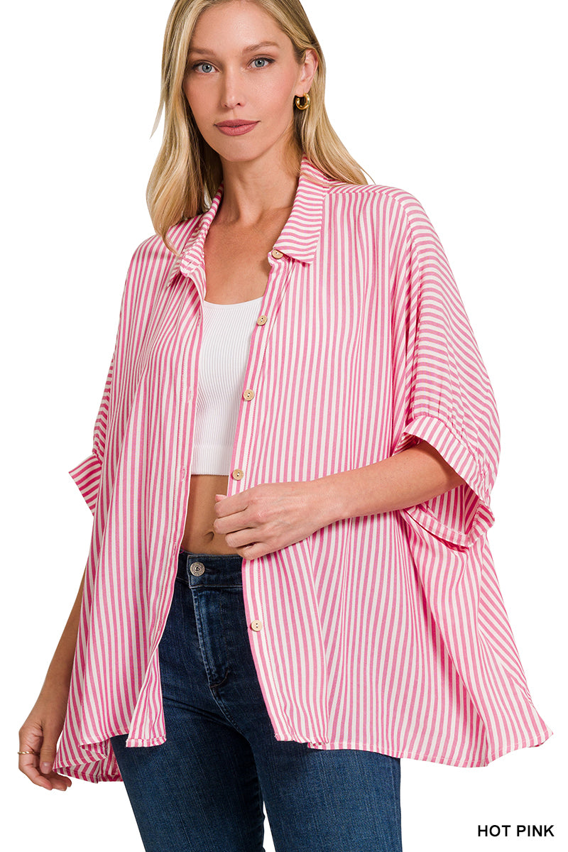 Effortlessly chic and comfortable, this oversized striped button-up shirt features a relaxed silhouette perfect for layering or wearing solo. Crafted from breathable 100% rayon, it drapes beautifully while maintaining its shape. The generous fit offers room to move, with an approximate bust of 67" and total body length of 25.5" (measured from S/M). Ideal for casual days or dressed-up occasions. Please note: colors may vary slightly depending on monitor resolution.