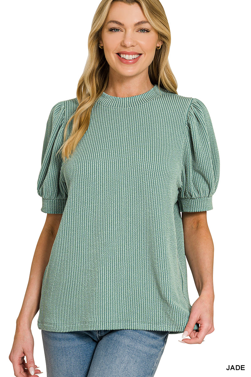 Elevate your everyday wardrobe with this raised rib puff sleeve top, featuring a flattering silhouette and comfortable stretch fabric. The voluminous puff sleeves add a modern touch, while the ribbed texture creates visual interest and dimension. Crafted from a breathable polyester-rayon blend with spandex for all-day flexibility, this versatile piece pairs effortlessly with jeans, skirts, or trousers. Approximate measurements from size small: 24" body length, 39.5" chest. Available in coral. Machine washable.