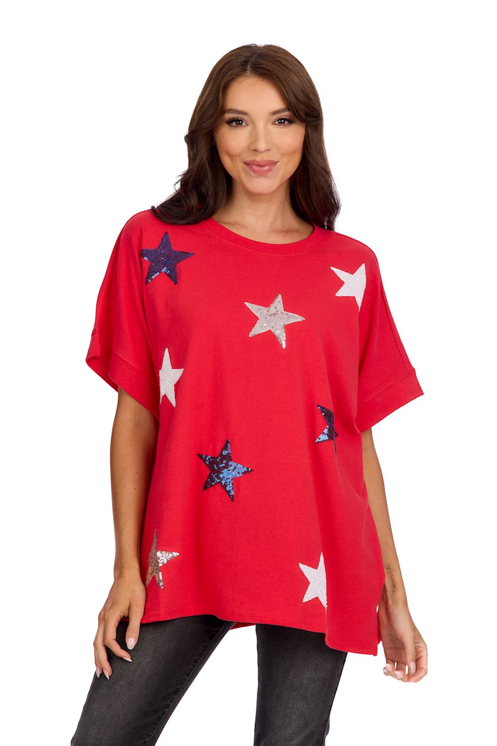 Elevate your wardrobe with this stunning cotton blend top, adorned with shimmering sequins and tinsel for a touch of glamour. The luxurious fabric combines the softness of cotton with the durability of polyester, ensuring both comfort and longevity. Designed with dolman short sleeves, this top offers a relaxed and stylish fit that drapes beautifully on any body type. The side slit hem adds a modern twist, providing ease of movement and a flattering silhouette. Measuring approximately 27 inches from shoulder to hem, this versatile piece is crafted to fit most sizes, making it a perfect addition to any fashion-forward collection. Whether you're dressing up for a night out or adding a bit of sparkle to your everyday look, this top is sure to make a statement.