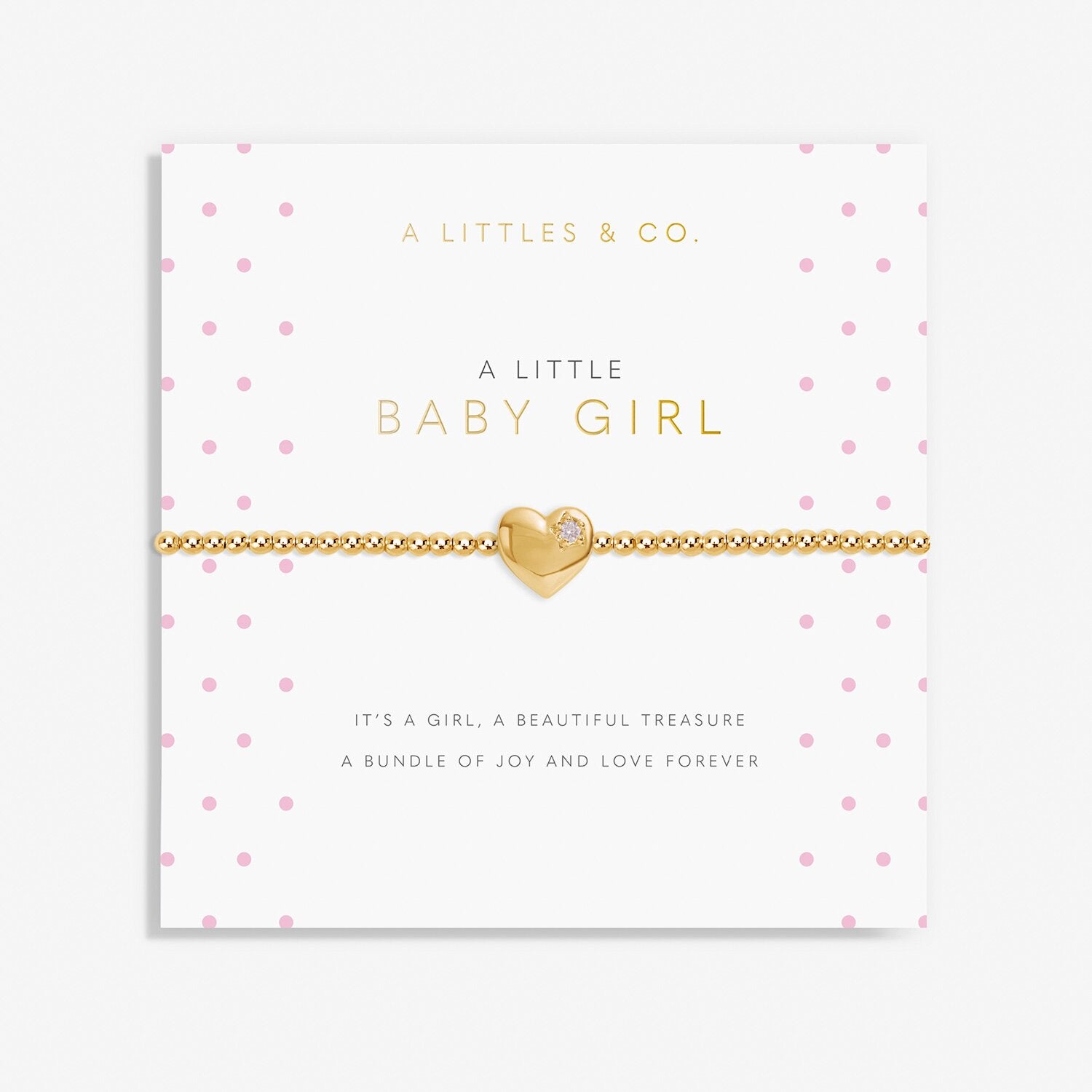 Our A Little 'Baby Girl' Bracelet is perfect for celebrating the new arrival, boasting a stretch-bead style that ensures a comfortable fit on any wrist. The bracelet is adorned with a gold-tone plated heart-shaped charm, which is wrapped around one of our stylized cards and framed by a heartfelt poem, the perfect treat for every new mama and mommy-to-be.
