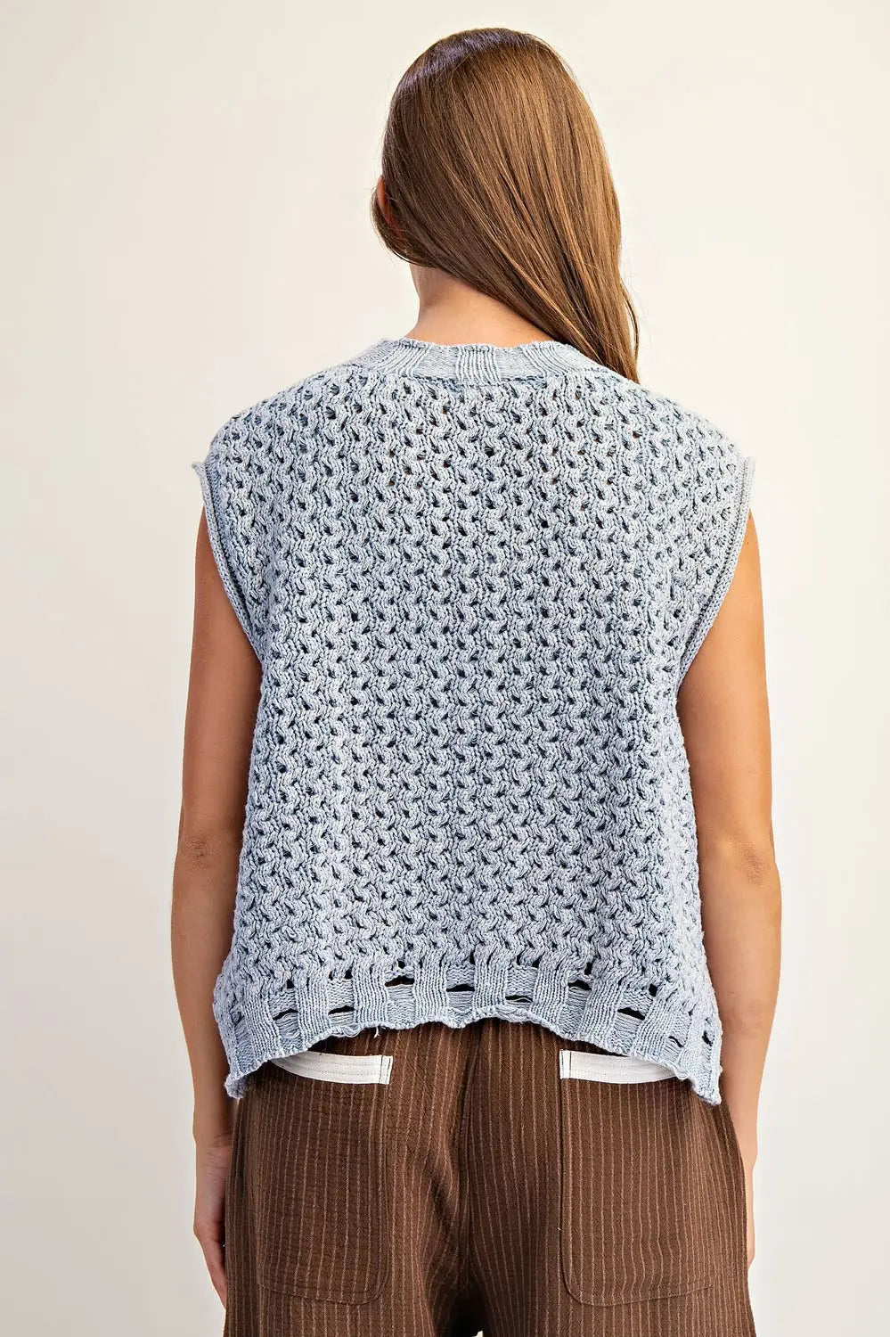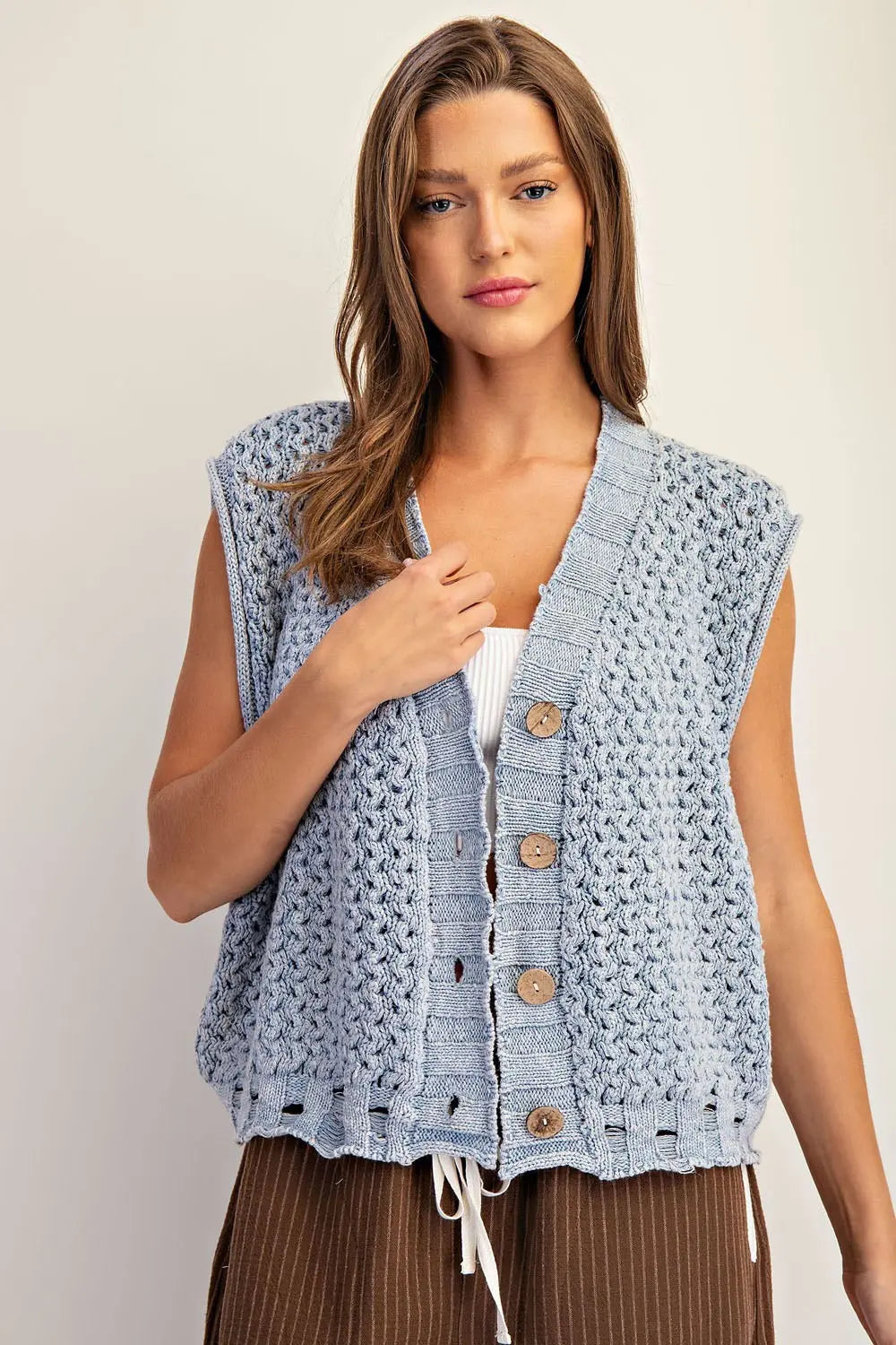 Product Detail: This sleeveless knit cardigan features a textured open stitch pattern, a button front closure, rolled armhole openings, and a wide ribbed placket, while the bottom hem showcases subtle distressing with cutout details for a perfectly lived in finish.