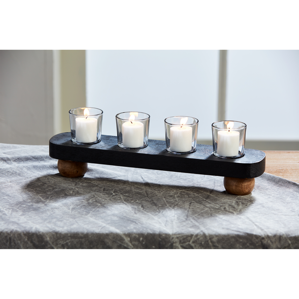 The Votive Holder With Feet is an exquisite and one-of-a-kind home decor piece. Crafted from mango wood, it showcases a stunning wooden board supported by oversized bead feet. With the capacity to hold four glass votives, it effortlessly creates a cozy and welcoming ambiance in any room. Kindly note that tea lights are not included. Elevate the elegance of your space with this exceptional votive holder.