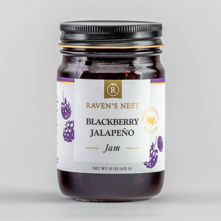 Raven’s Nest Blackberry Jalapeño Jam is a bold blend of ripe blackberries with a subtle kick of jalapeño. All-natural, gluten-free, and preservative-free, this versatile jam elevates both sweet and savory dishes. Warm and pour over cream cheese or baked brie, spread on grilled meats, use in baked goods, or stir into a Spiked JAMtail or Blackberry Jalapeño Lemonade! ✅ Clean Ingredients ✅ Gluten-Free & Preservative-Free ✅ Made in the USA Size: 15 oz