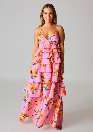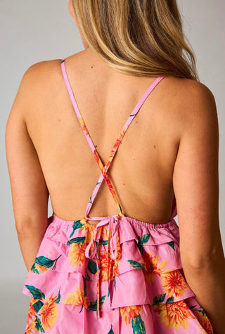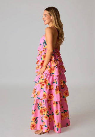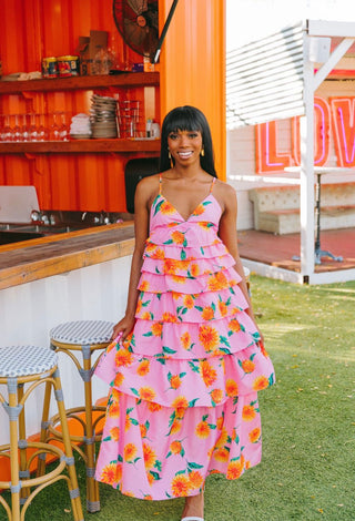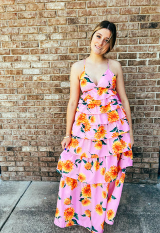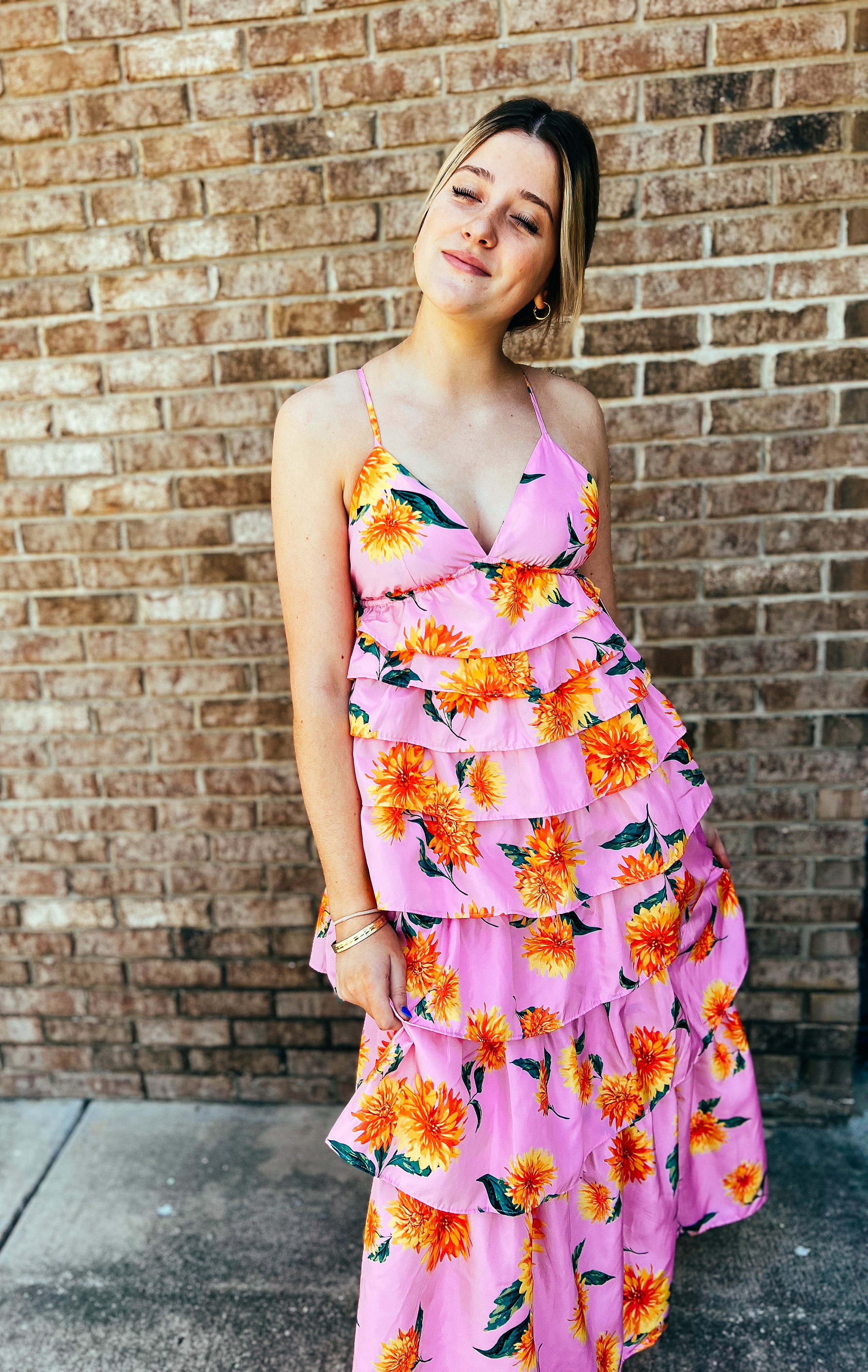 Be a showstopper in our new Callie Dress!  Callie features a tiered sunflower print on pink with spaghetti strap sleeve. She is perfect for any summer event!