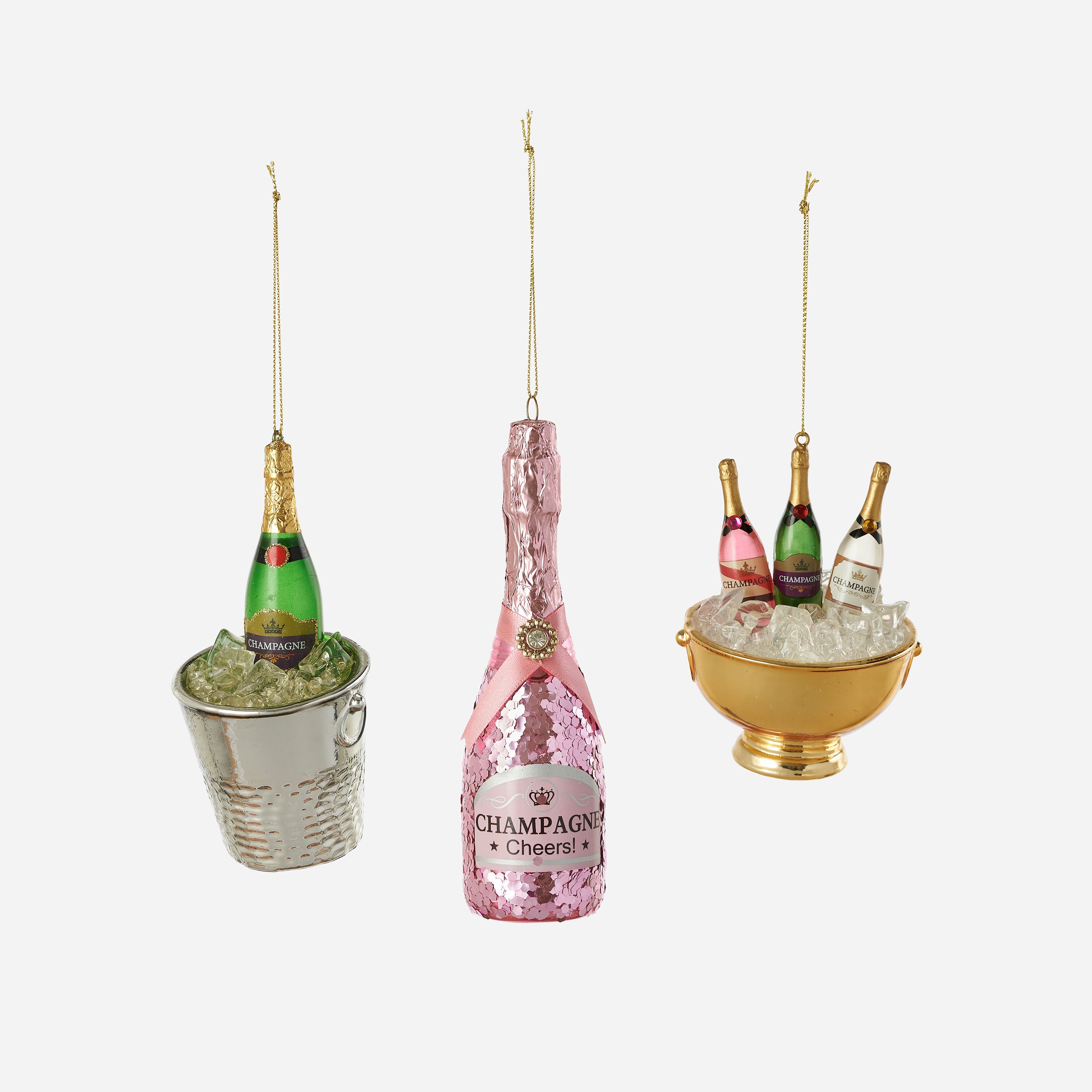 Celebrate in style with these playful Champagne Ornaments! Made from delicate glass, each ornament adds a sparkling touch of festive fun to your décor. Perfect for toasting the season, their assorted designs bring charm and cheer to any celebration. Cheers to a sparkling holiday!