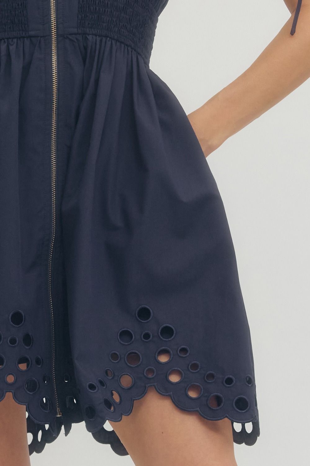 Twirl into spring with the Charlie Scalloped-Hem Dress in Navy. This charming mini features statement puff sleeves, a flattering V-neck, and a smocked waist that cinches just right. The scalloped eyelet hem adds a delicate finishing touch, while the front zipper makes getting dressed effortless. Lined and crafted from lightweight woven fabric, it's perfect for garden parties, brunch dates, or any occasion calling for a pop of color and personality.