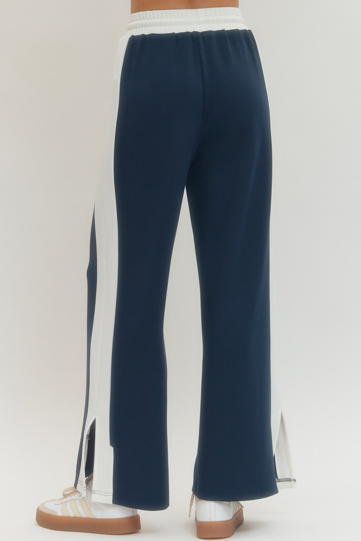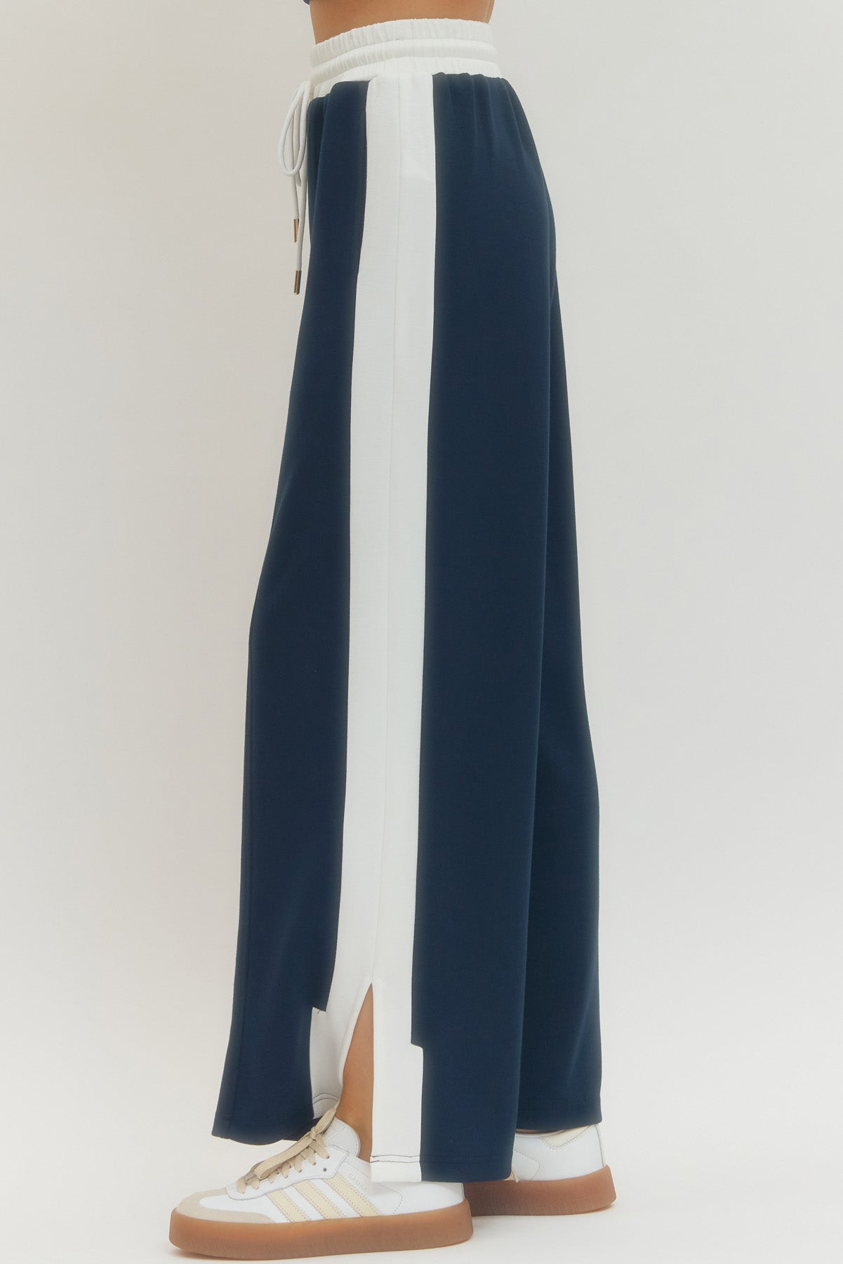 Effortless comfort meets laid-back style with these Cheyenne wide leg knit pants. Crafted from lightweight knit fabric, they feature a relaxed silhouette that moves with you, complete with an adjustable elastic waistband and drawstring for the perfect fit. Eye-catching contrast stripes run down the sides, while functional side pockets and a chic slit hem add personality to every step. Non-sheer and unlined for breathable, all-day wear that feels as good as it looks.