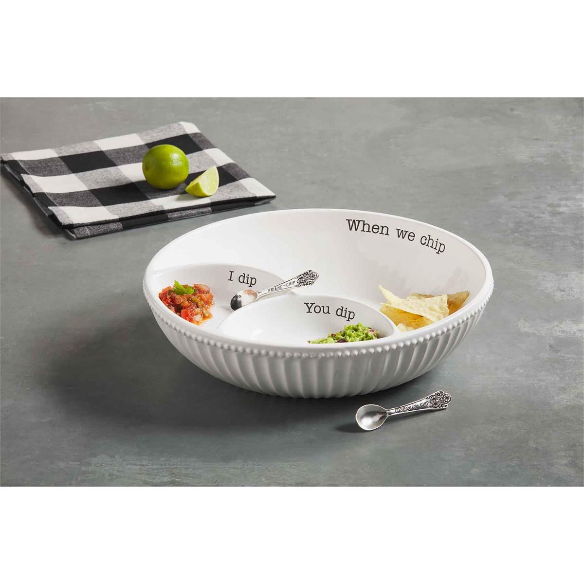 When we chip, you dip in this Chip and Double Dip Set. The three piece set comes with a fluted and beaded ceramic chip bowl that reads "When we chip". The bowl comes with two integral dip wells that read "I dip" and "You dip". The set comes with two stamped silver-plate spoons.