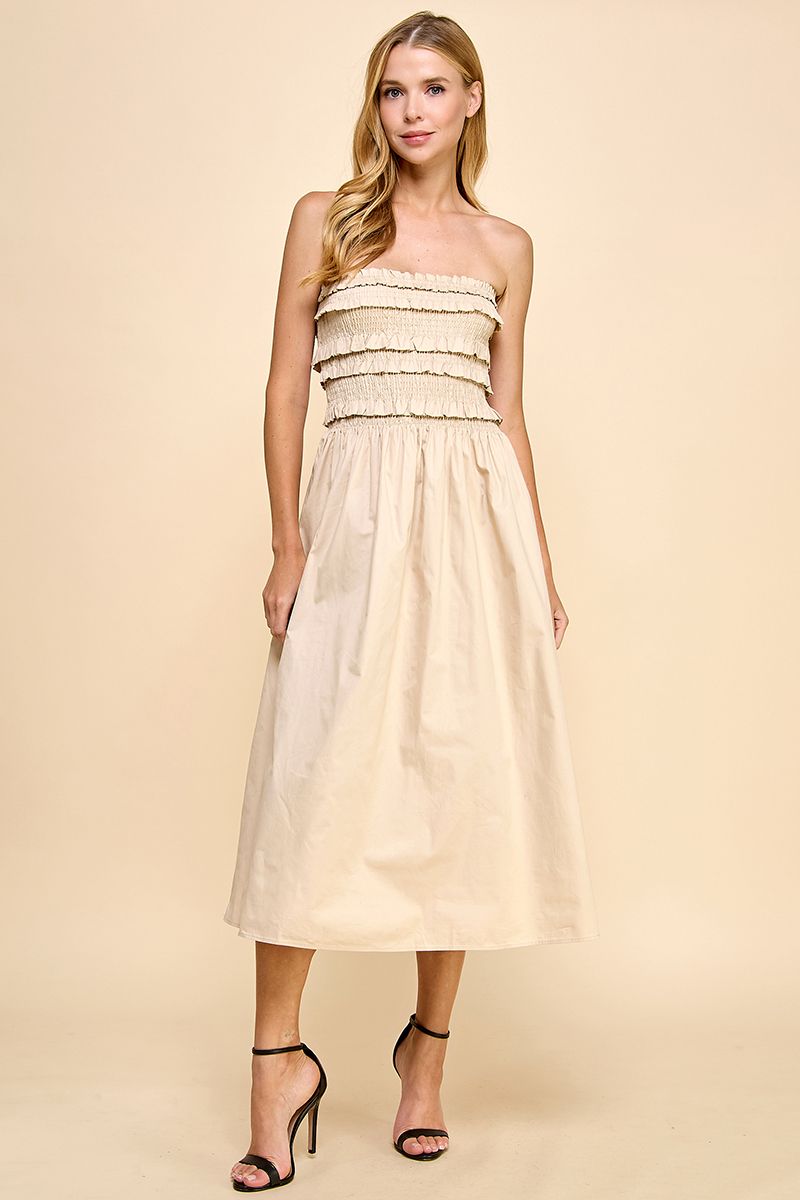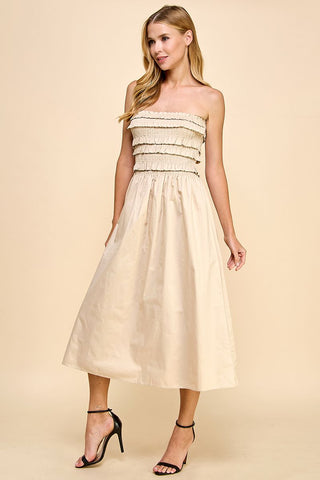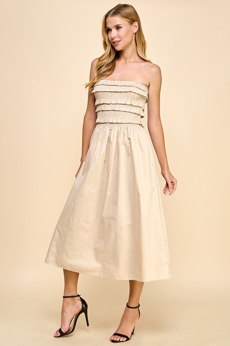 Introducing the Elsie Strapless Ruffle Dress! This midi dress features a solid strapless design for a sleek and stylish look. The fitted smocked top with ruffle detailing adds a touch of playfulness and uniqueness. Perfect for any occasion, this dress will be sure to turn heads.