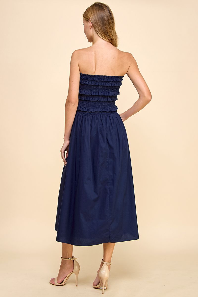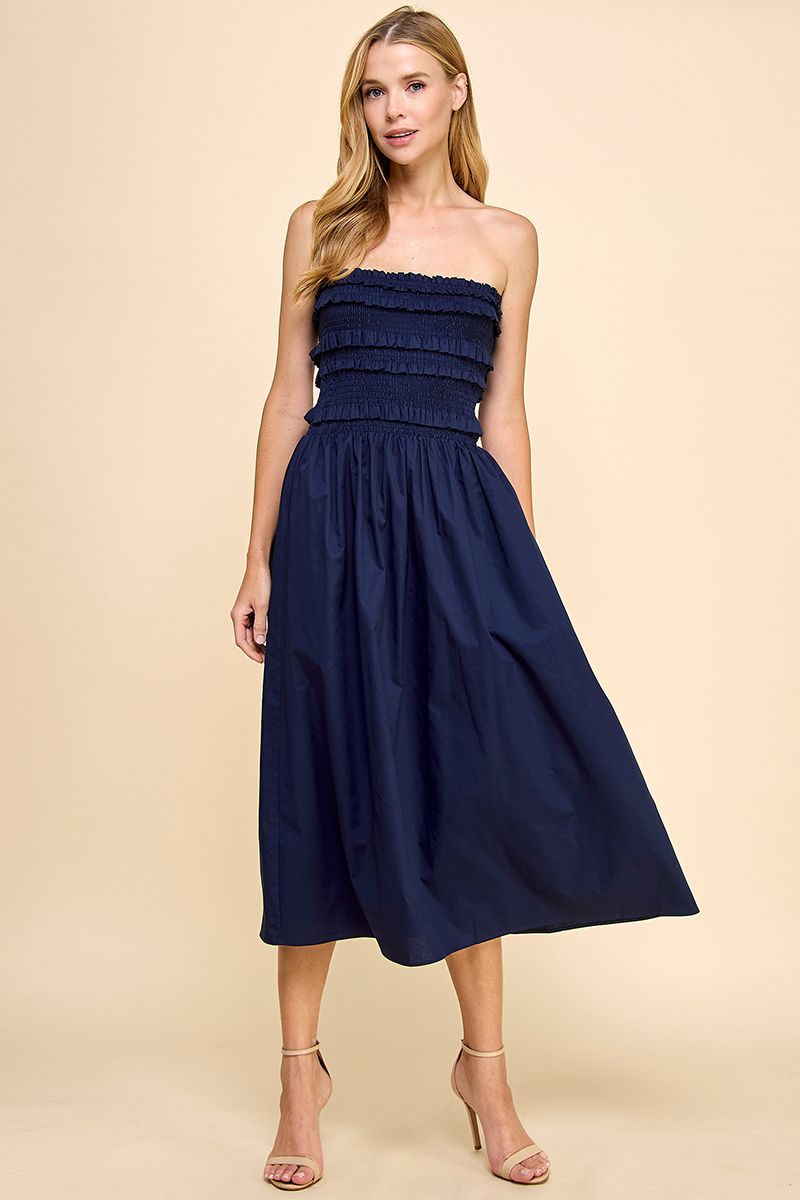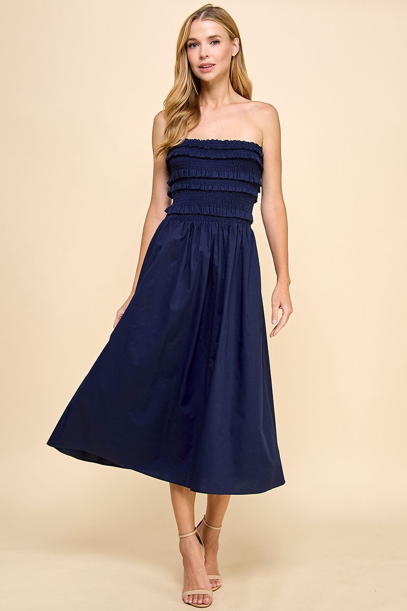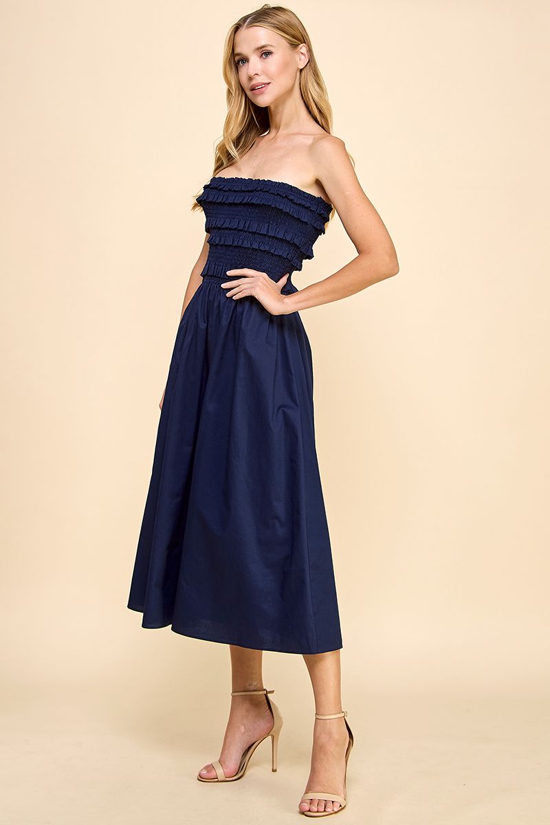 Introducing the Elsie Strapless Ruffle Dress! This midi dress features a solid strapless design for a sleek and stylish look. The fitted smocked top with ruffle detailing adds a touch of playfulness and uniqueness. Perfect for any occasion, this dress will be sure to turn heads.