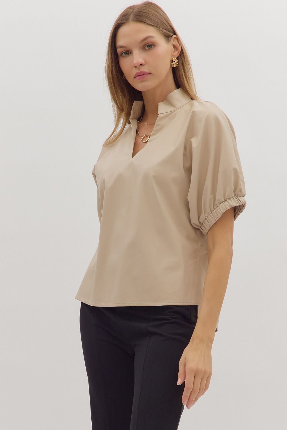 This Everly Puff Sleeve V-Neck Top in soft ecru combines playful charm with chic simplicity. Crafted from a lightweight, woven faux leather blend of cotton and polyurethane, it features a stand collar and a flattering split V-neck. The short puff sleeves end in elasticated openings for a comfortable, fun fit that’s never see-through. Unlined and breezy, it’s perfect for adding a touch of stylish edge to your everyday wardrobe.