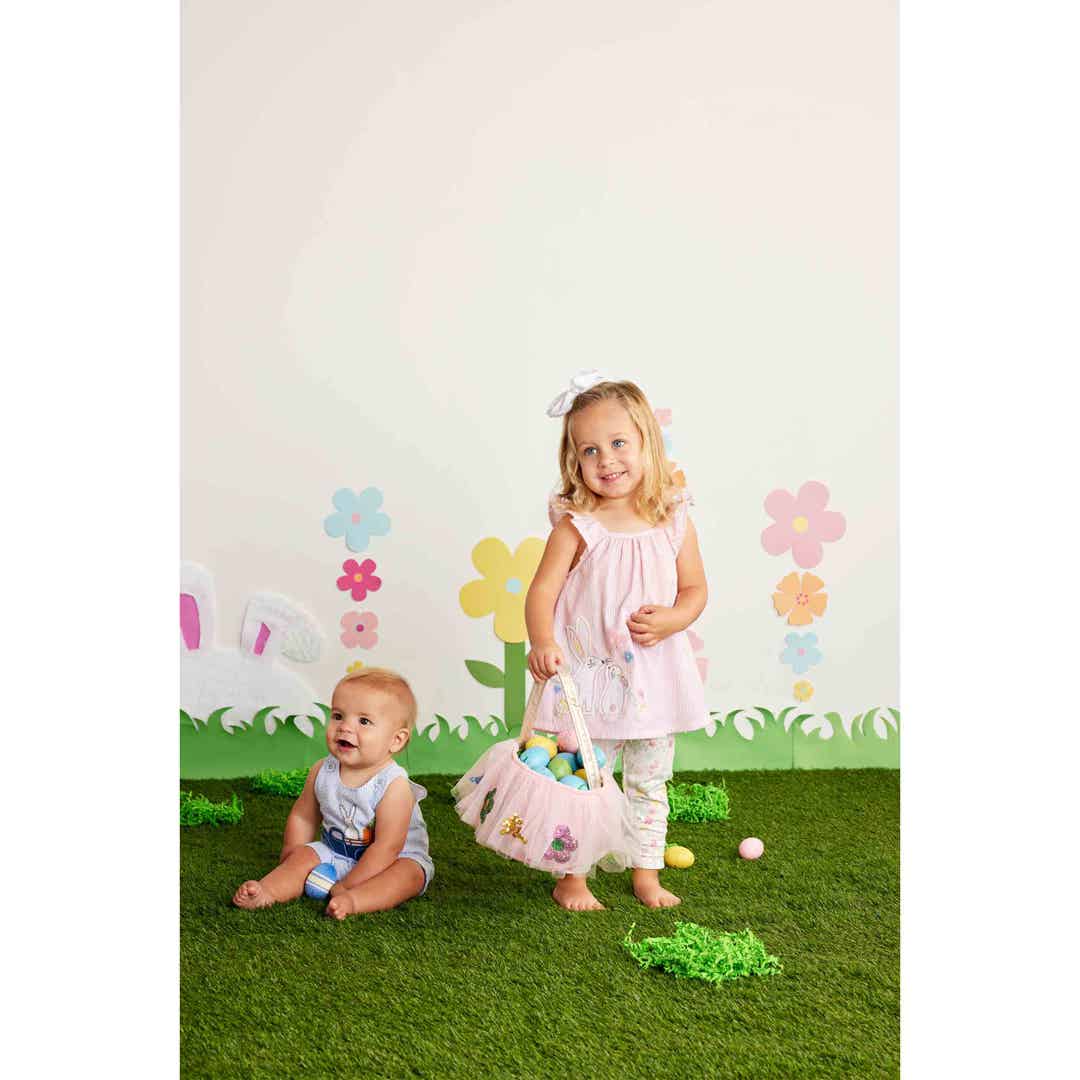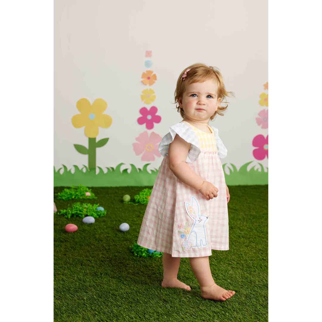 No-bunny can beat these sweet Girl's Bunny Gingham Dress. The appliqued gingham dress features flutter short sleeves. The dress features color block sections of yellow, blue and pink gingham patterns. The dress also features bunny and floral applique details on the bottom.