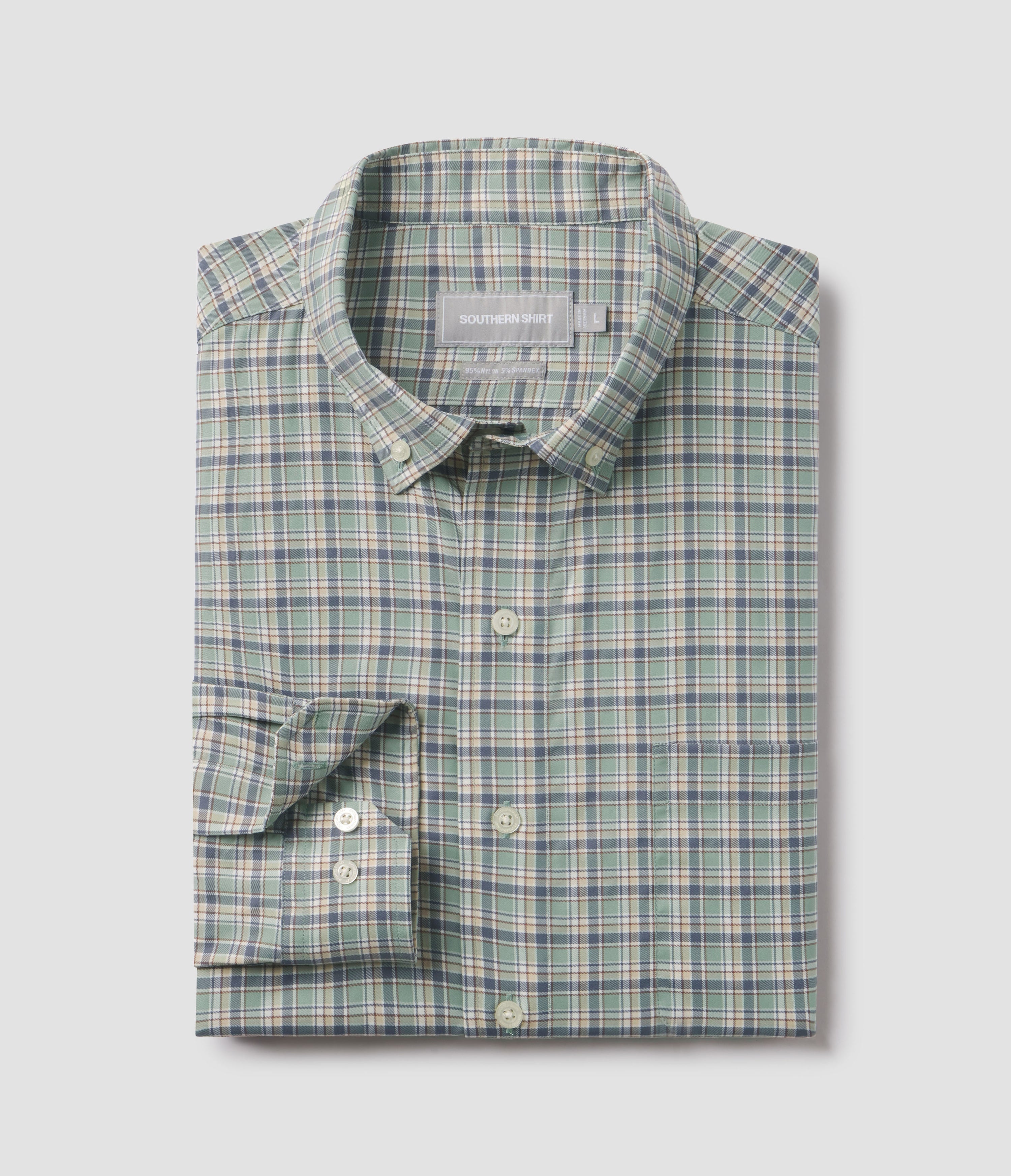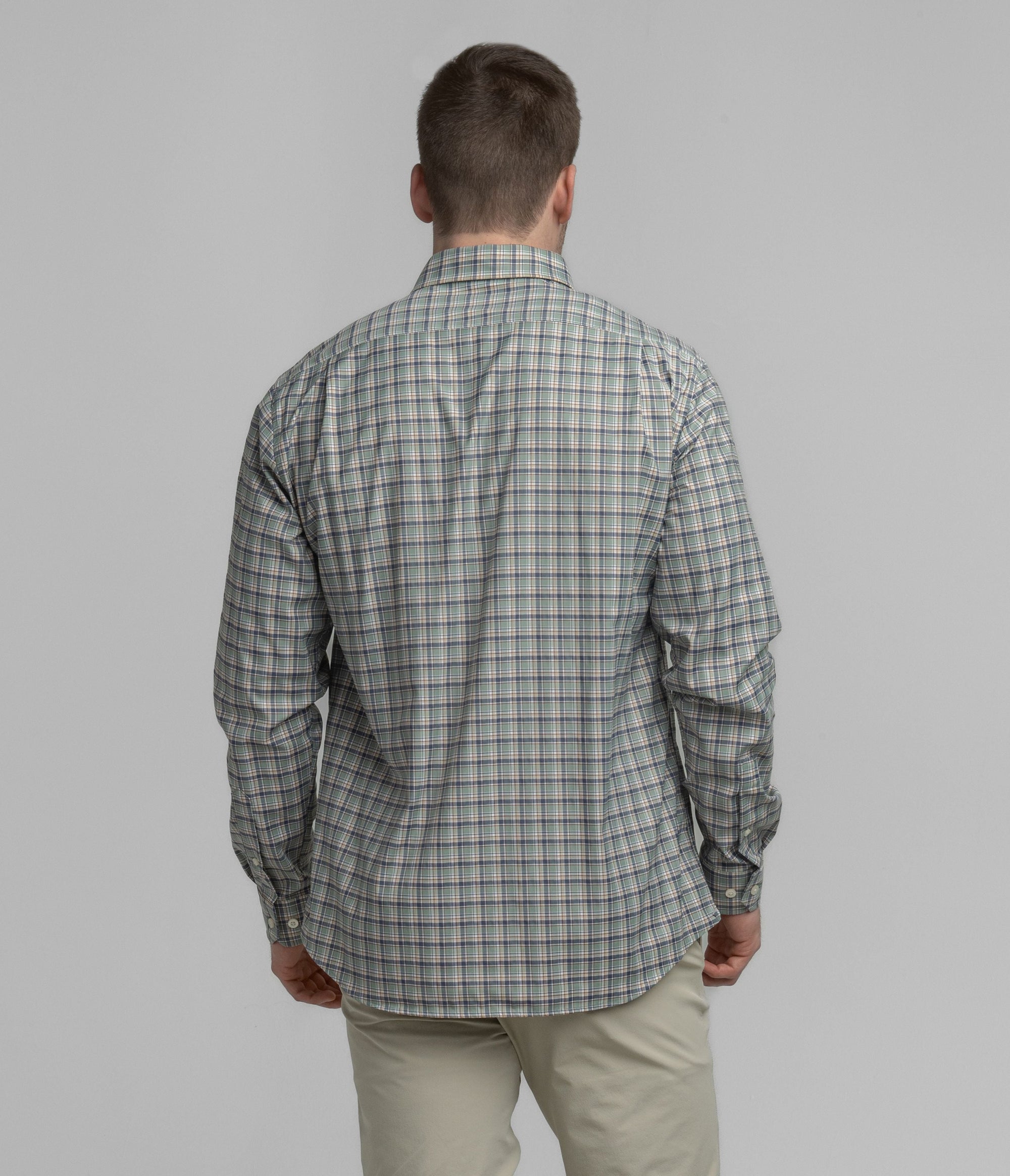 Crafted from a 95% nylon / 5% spandex yarn-dyed poplin, it features 2-way stretch, moisture-wicking, quick-dry technology, and wrinkle resistance—making it a reliable choice for travel days, tailgates, or business casual. A button-down collar, mitered cuffs, and tapered tuckable hem bring in clean lines, while the front chest pocket and embroidered side gusset add thoughtful detail. Unique in-house check patterns set this one apart from every other shirt in your closet.