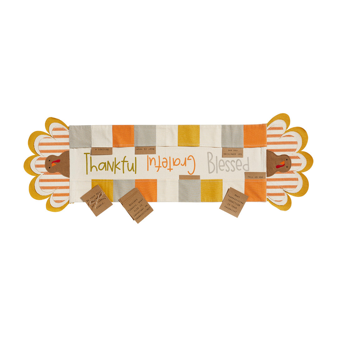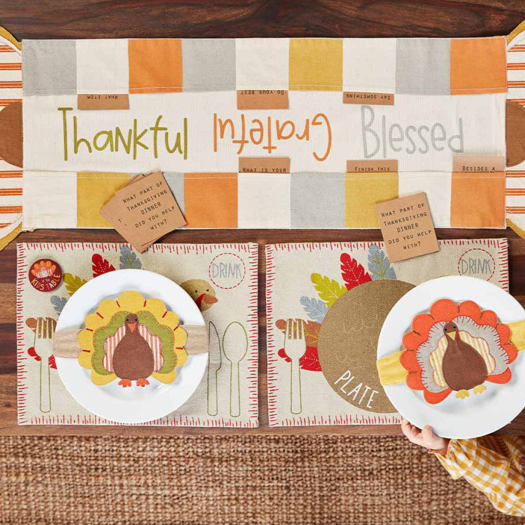 Start a new Kids table tradition with our Kid's Turkey table runner. The two piece set comes with a turkey table runner. The table runner features the phrase "Thankful, Grateful, Blessed" on it. The table runner has pockets. The table runner comes with set of 27 kraft cards to play a Thanksgiving conversation-starter game.