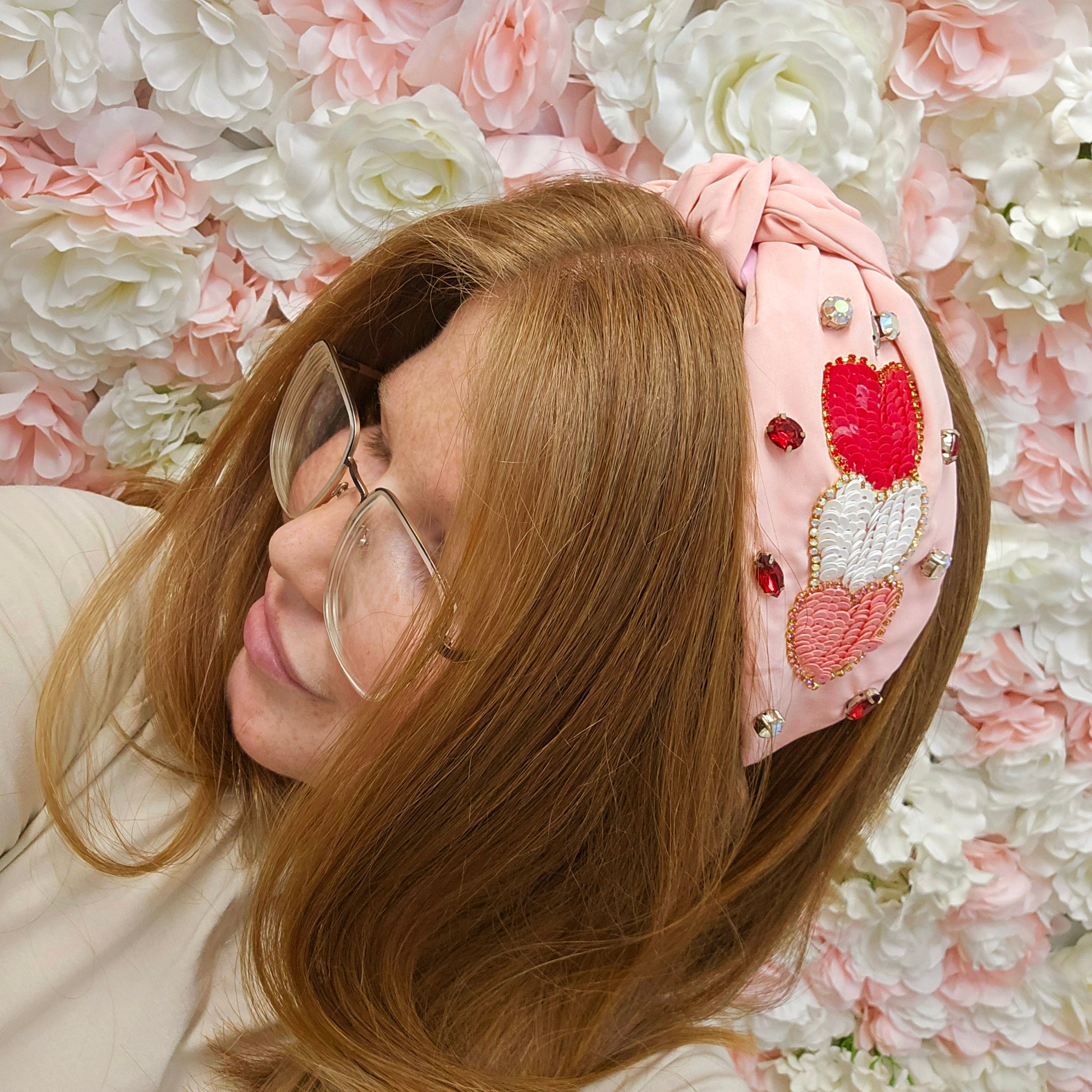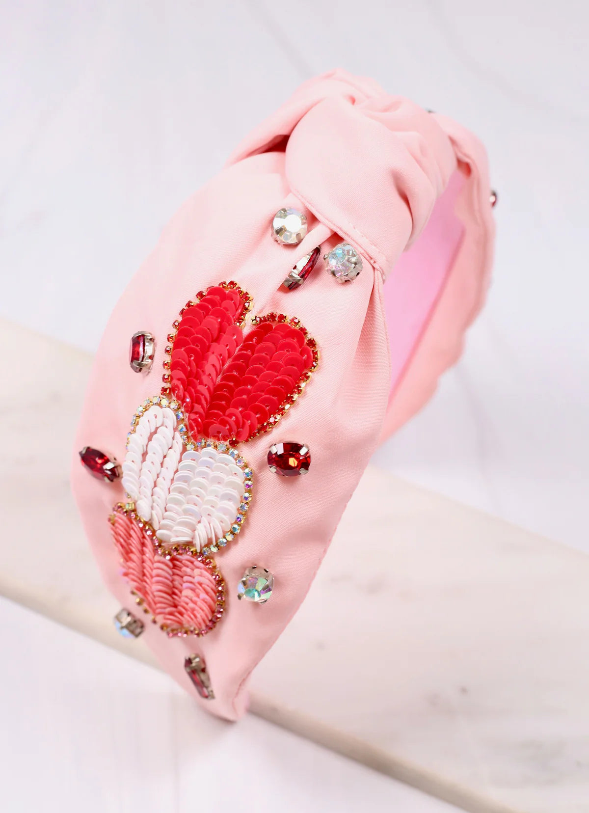 This fabric headband features three sequin hearts outlined in rhinestones for a Valentine's Day ready look! It has a top knot accent and gemstones as well.
