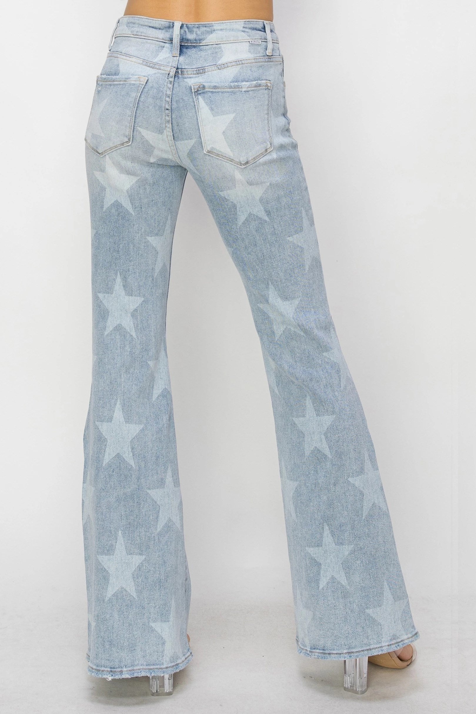 Mid Rise Button Down Star Print Flare Jeans • Light