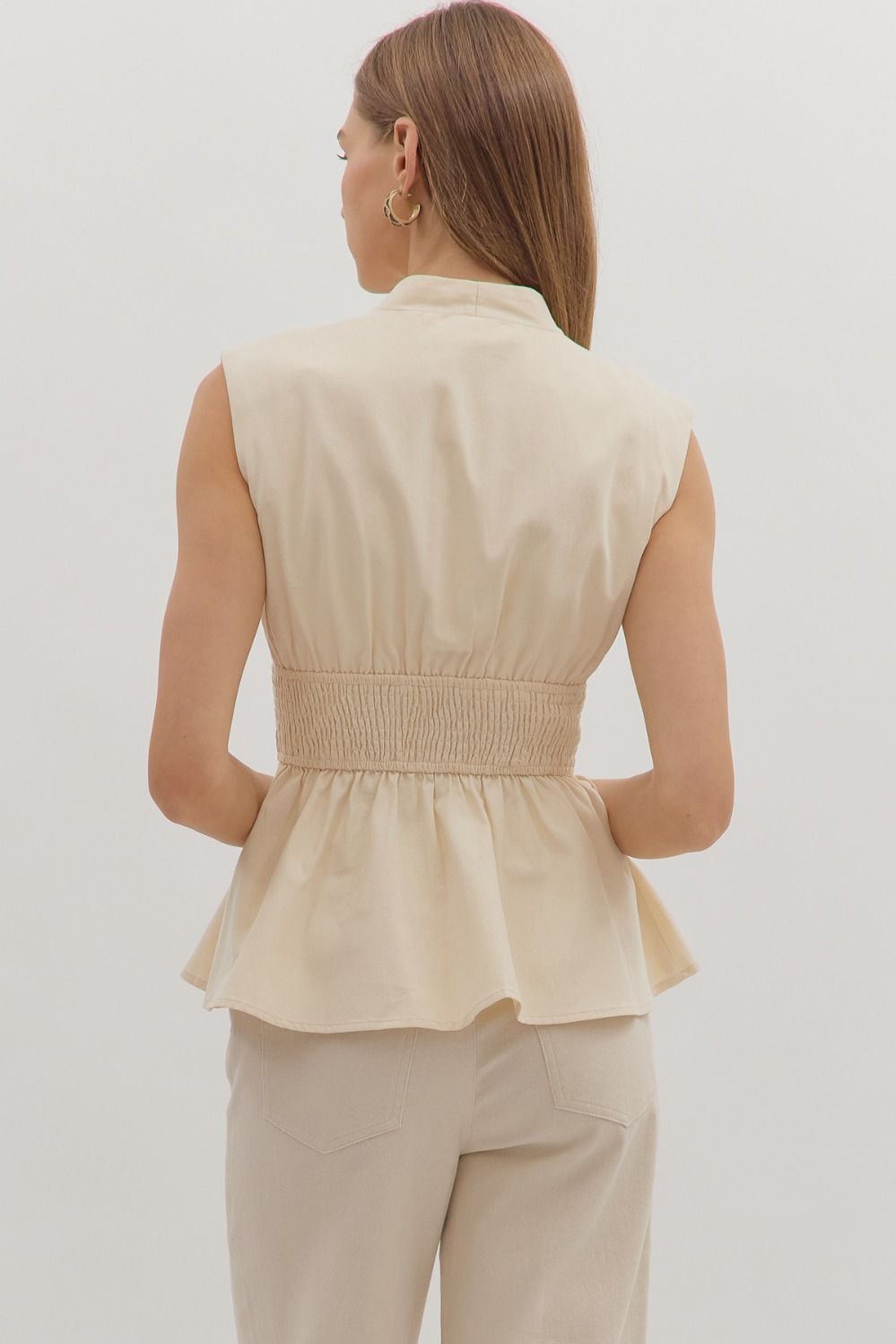 Brighten your wardrobe with the Presley Sleeveless Peplum Top in ecru! This lightweight, woven denim piece boasts a fun peplum flare and a wide smocked waist that adds playful shape and comfort. Easy to slip on with its chic front zipper, it’s unlined and perfectly breezy for sunny days. Effortlessly stylish and non-sheer, it’s your go-to for a fresh, flirty look that moves with you.
