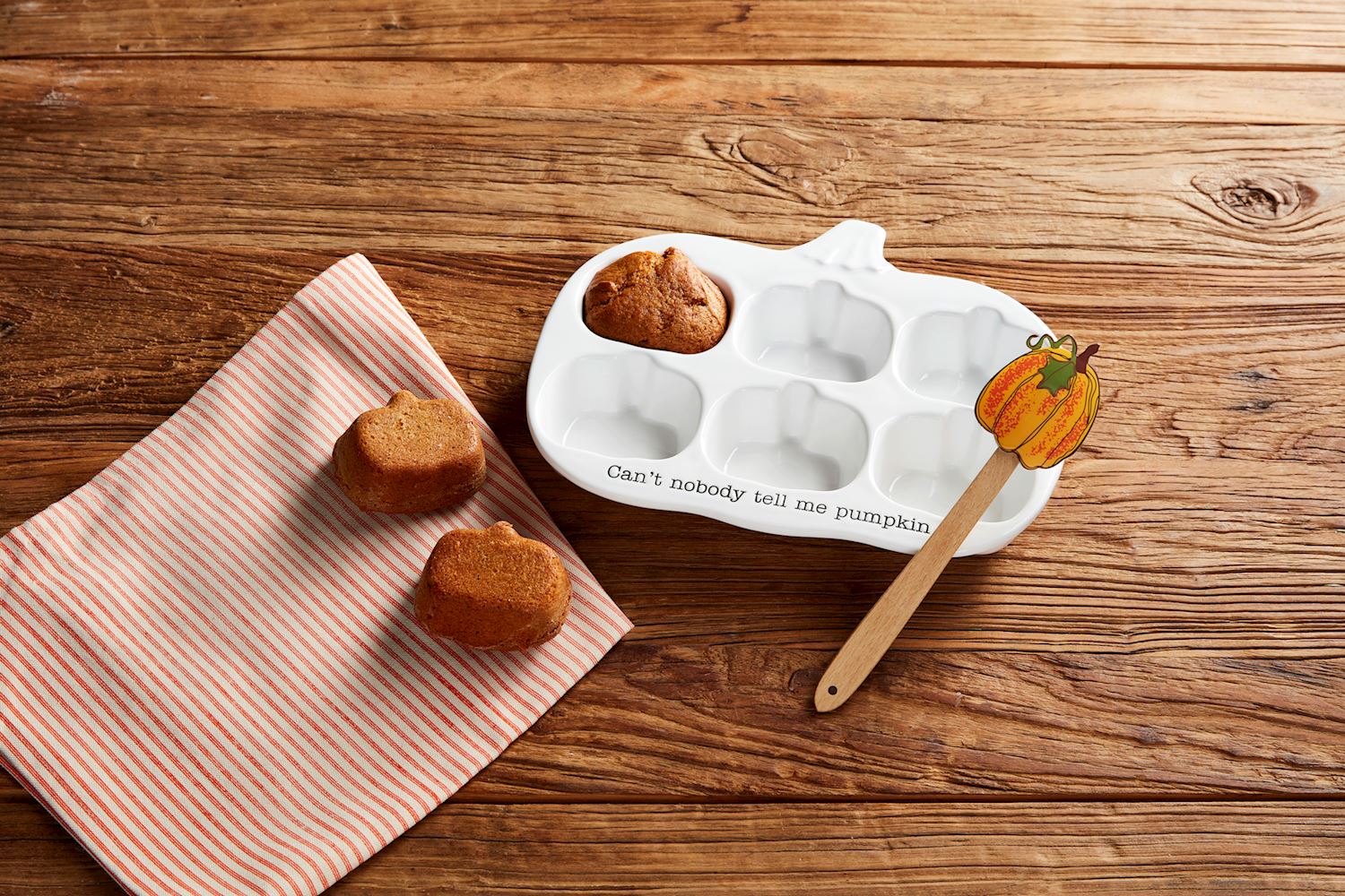 Bake autumn treats with a smile using this playful 2-piece Pumpkin Muffin Tray Set! The ceramic pan features charming pumpkin-shaped molds for festive muffins, while the included silicone and wood spatulas make mixing and serving a breeze. Perfect for adding a touch of seasonal fun to your baking adventures.