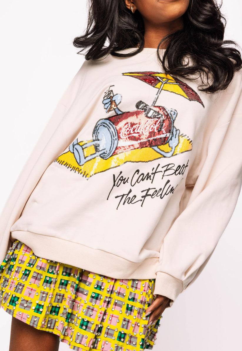 Stay cozy and stylish with this beige sweatshirt featuring a playful sequin design of a Coke can sunbathing on the beach alongside the phrase "You Can't Beat The Feeling." Perfect for adding a fun, sunny vibe to your casual wardrobe while keeping you comfortable all day long.