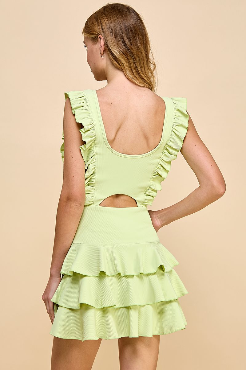 Step up your athletic game with our Sanibel Athletic Dress! This mint-colored dress features a tiered ruffle skirt and a small center back cut out, adding a touch of femininity and fun to your workout attire. Keep cool and stylish while you break a sweat in this sleeveless dress.