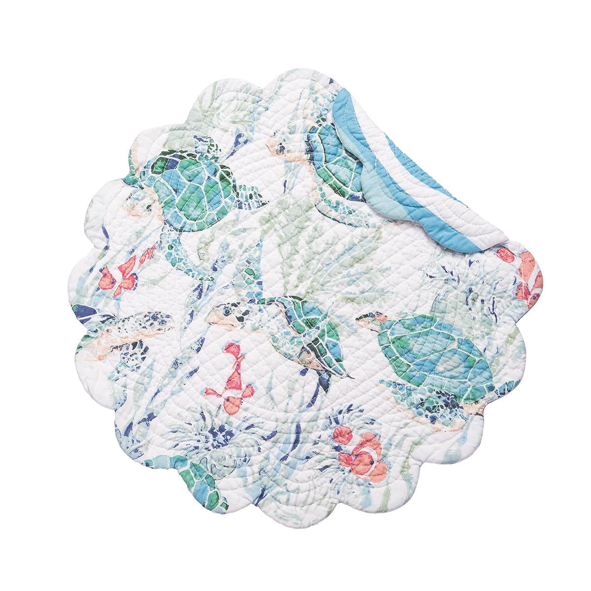Bring a coastal touch to the dining room with the Sea Turtle Cove tabletop collection. Featuring turtles, fish, and coral, this quilted collection makes a statement in any ocean-inspired home. The colors featured are blue, green, and orange, perfect for creating a tranquil coastal atmosphere. The scallop-edge table linens a wavy line pattern in coordinating colors. Available as a napkin, placemat, round placemat, and runner. Love this pattern? Sea Turtle Cove is also available as a bedding collection.