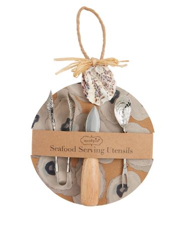 Set of three stainless steel seafood utensils: tongs, oyster knife and spoon.