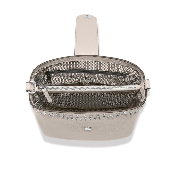 Combining edgy design with functional appeal this is a standout accessory for the modern individual. It has a roomy interior with a center zipper divider to keep your necessities secure. Features an adjustable strap for versatility from shoulderbag to Crossbody. Perfect for every day, this bucket bag transitions seamlessly from casual daytime outings to evening adventure.
