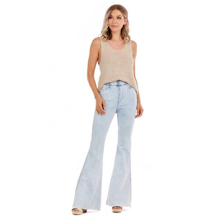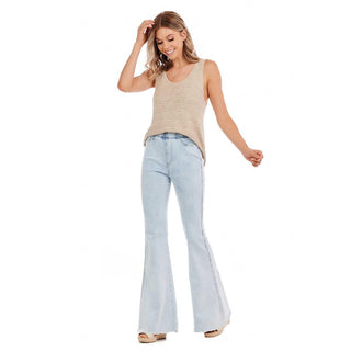 Our Lyla Blue Flare Jeans are the perfect pairing piece this Spring! The cotton spandex stretch denim jeans feature an elastic waist. The jean features a flare leg opening with raw edge hem. The jeans also feature back pockets. The inseam measures approximately 33 1/2" on size small.