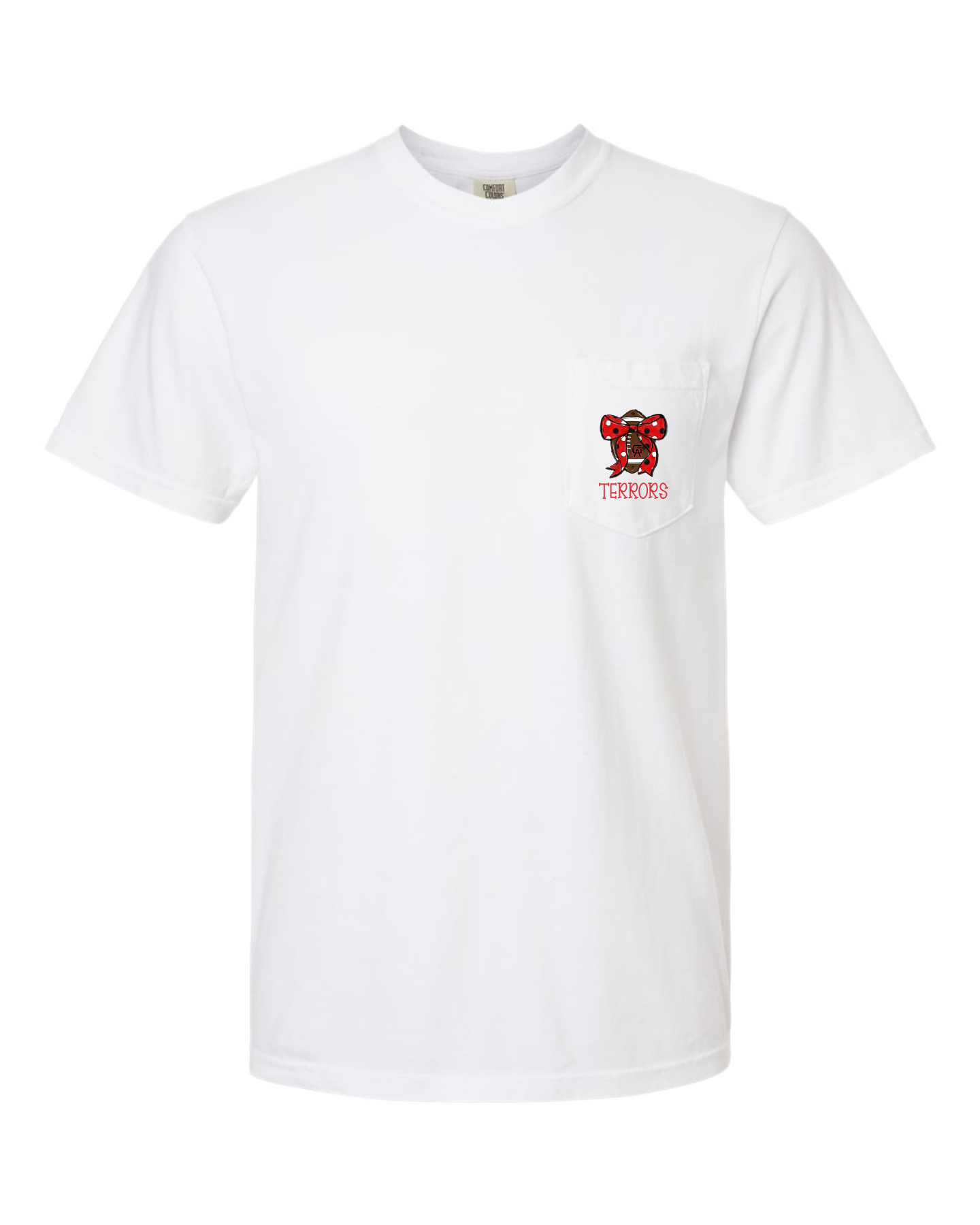 Show your team spirit with the Terrors Football Bow Pocket Tee in White. This comfy tee features a cozy pocket and a playful football bow design, with your team's name proudly displayed on the back alongside the logo. Perfect for game day or casual fun, it combines comfort and style with a spirited twist.