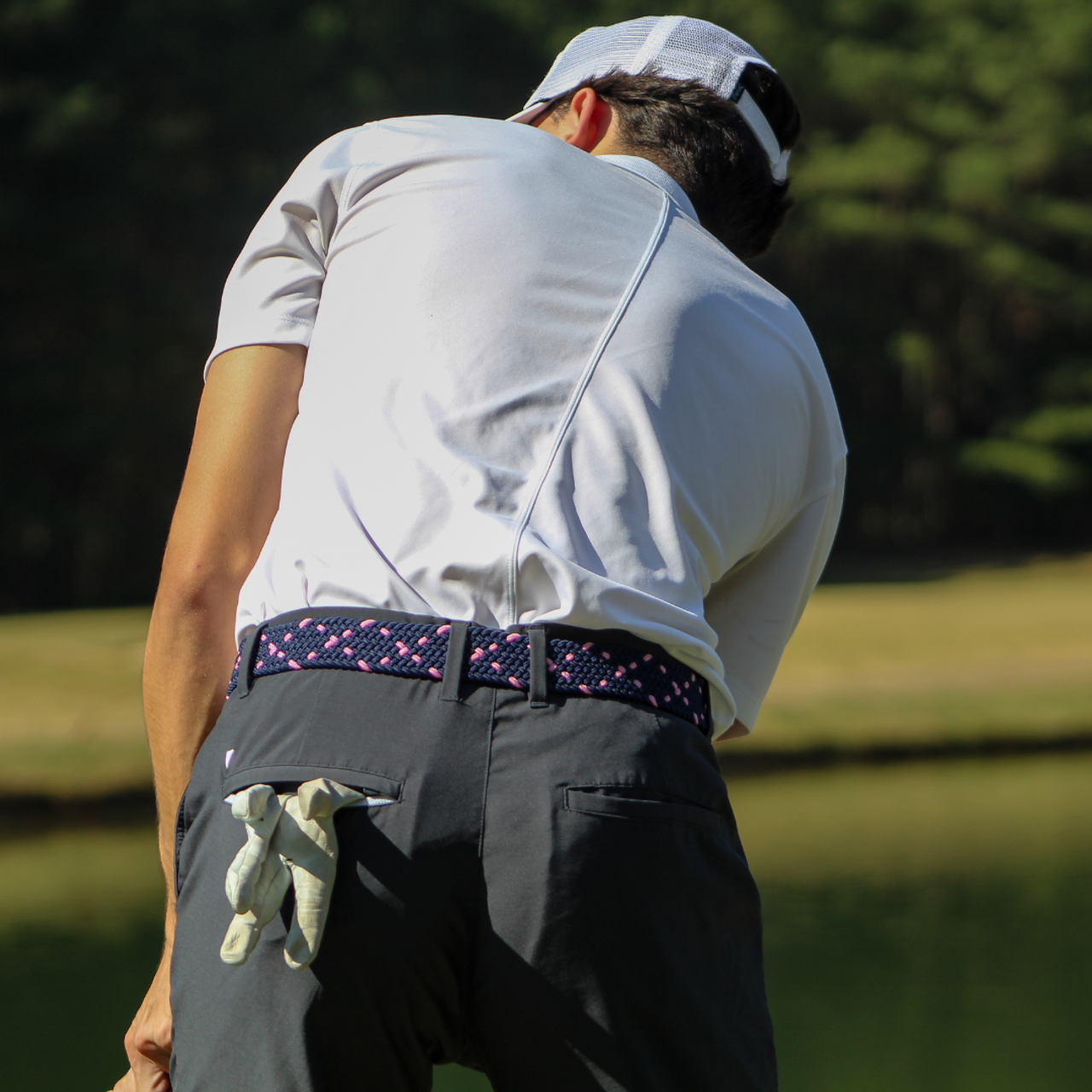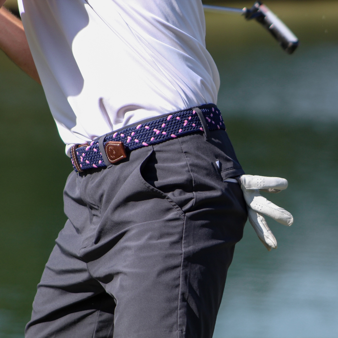 The Hartford two-color woven X-Series elastic-stretch belt. Navy and Pink belt with a rounded buckle and dark brown leather finish stamped with the Roostas logo. An adjustable clasp goes through the woven belt, allowing for adaptable sizing. Designed for comfort both on and off the course.