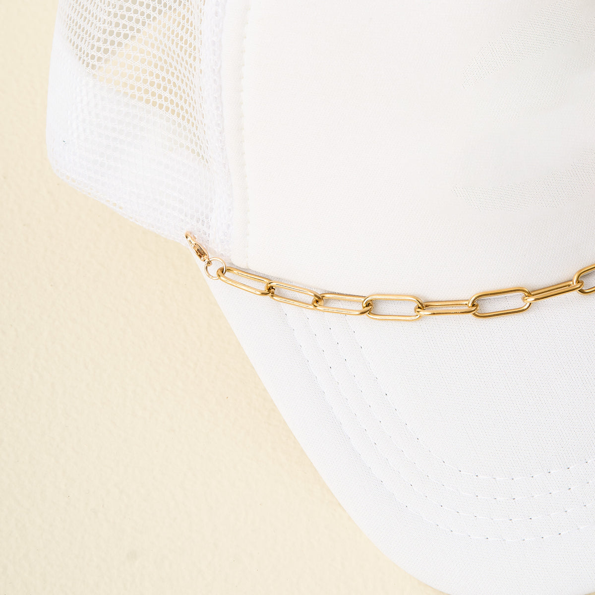 Introducing the newest accessory for hat lovers: the new Trucker Hat Chain! This versatile accessory effortlessly elevates your favorite hats. Crafted to fit seamlessly onto standard trucker hats, it features double-ended lobster clasps for easy attachment to the hat's mesh backing– simply snap on and go! Personalize your unique style effortlessly with chic gold metallic chains or dainty pearls