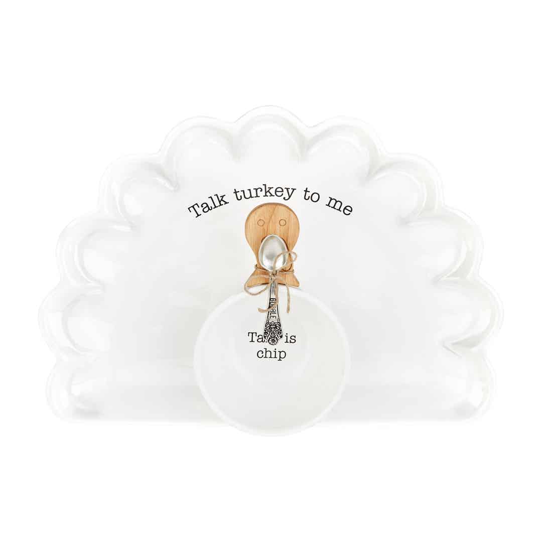 Talk turkey to me! Make sure you snatch our turkey chip and dip bowl set. The three piece set comes with a ceramic chip turkey fan tray. The tray features the phrase "Talk turkey to me". The tray includes a removable dip bowl with wooden turkey face. The bowl reads "Talk is chip". The set comes with a silver-plate spoon that reads "Gobble".