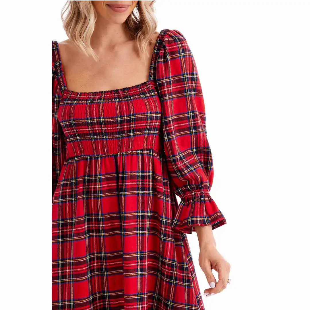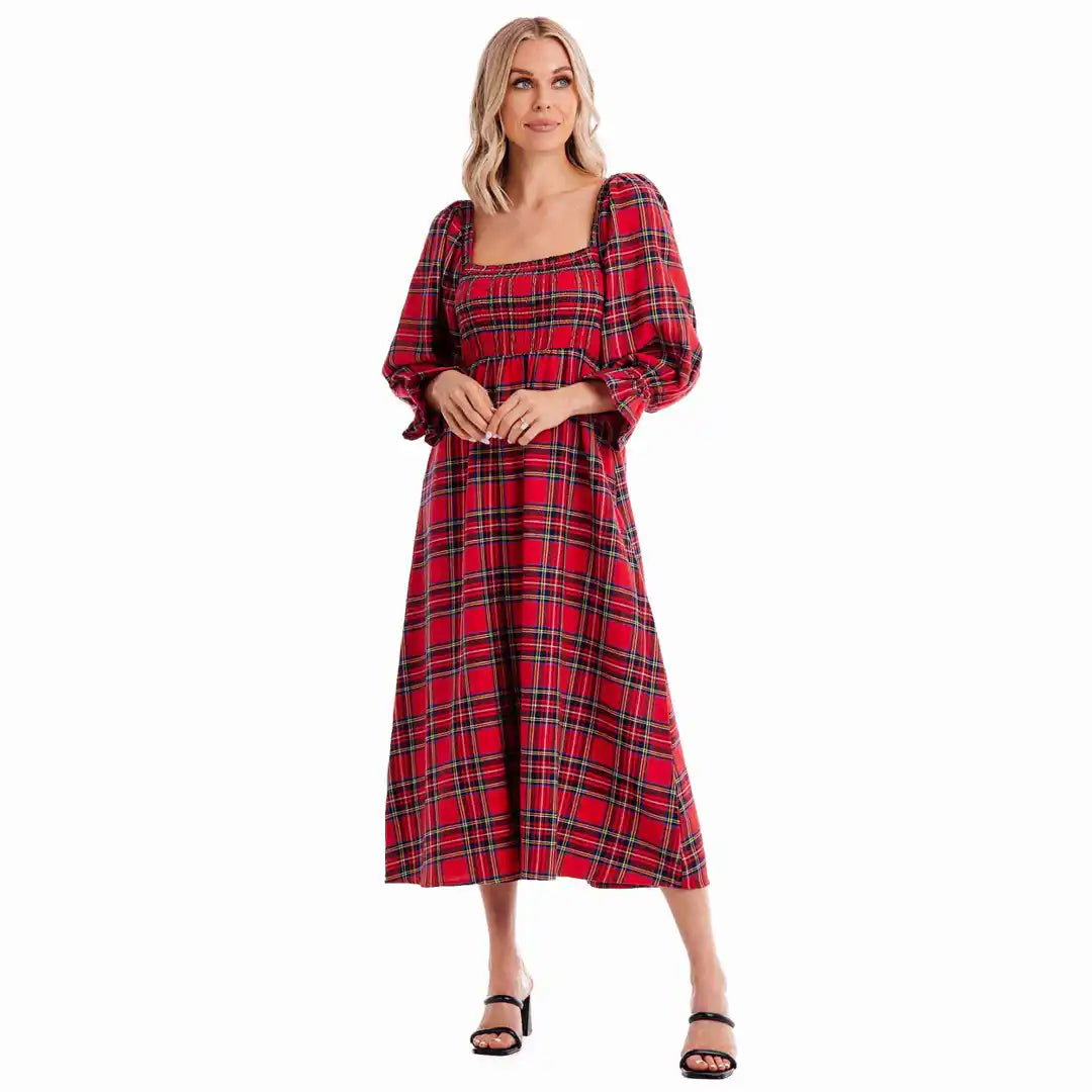 Our Vanessa Plaid Midi Dress is a stunning blend of timeless elegance and contemporary style. Crafted from premium flannel, this midi dress boasts a sophisticated polished design that will capture your heart. With its classic tartan plaid pattern, it exudes a sense of charm and versatility. The dress showcases smocking at the chest, accentuating your silhouette and providing a comfortable fit. Its square neckline adds a touch of modernity, while the flounce detail at the sleeves adds a feminine flair. Measuring approximately 48" from shoulder to hem (size small), this dress is an ideal choice for various Christmas festivities.