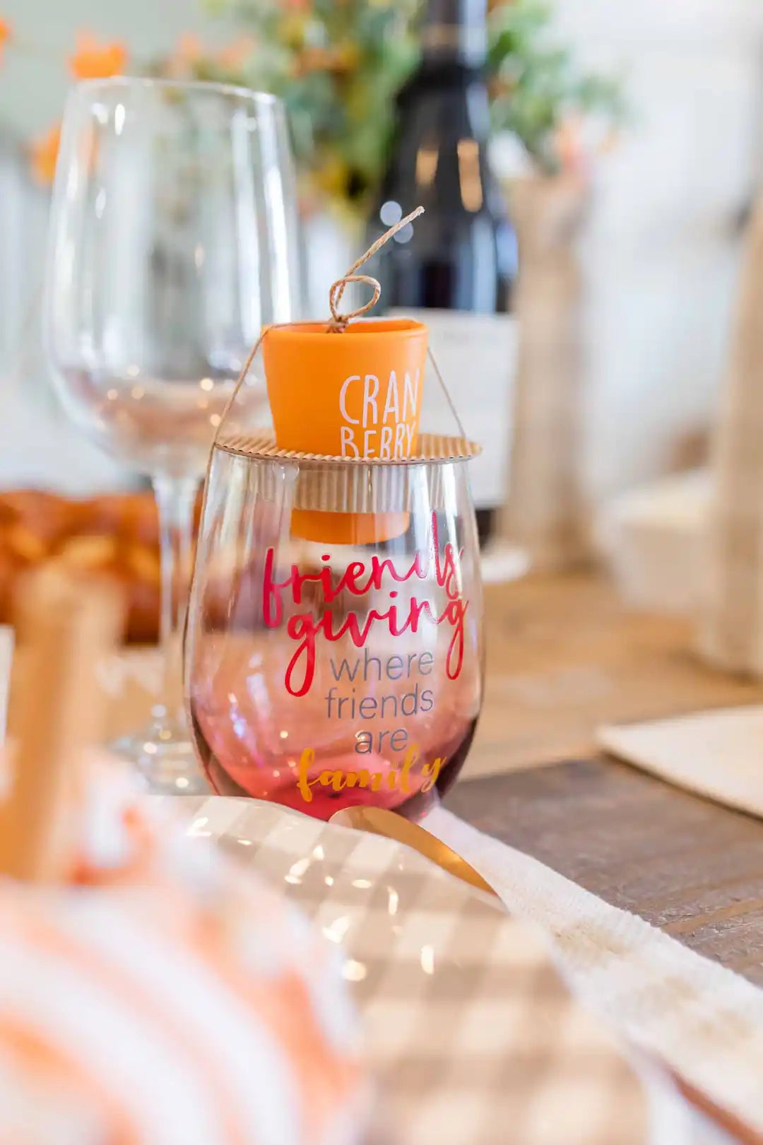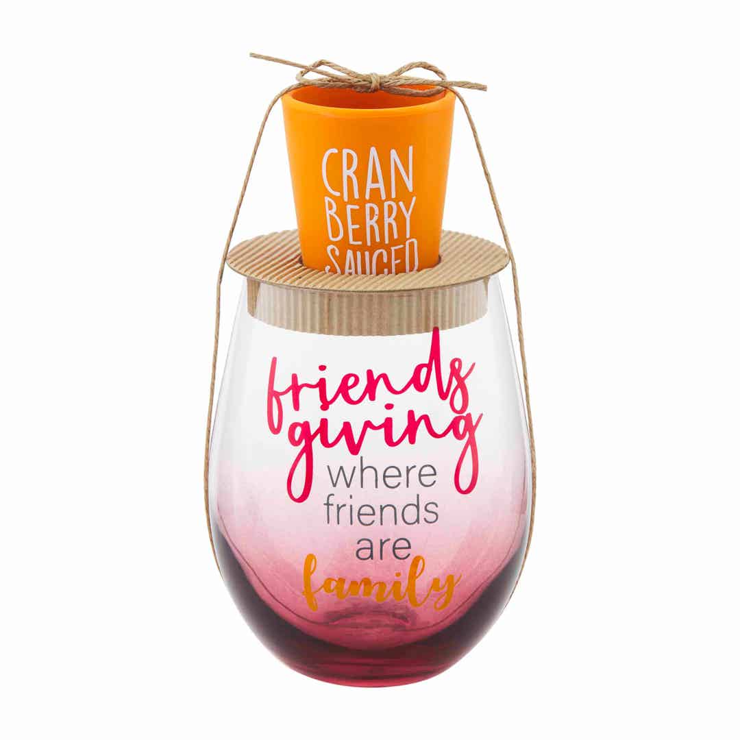 Let's get basted this Thanksgiving with our Cranberry Sauced Wine and Shot Glass Set. The two piece set comes with an ombre stemless wine glass that reads "Friendsgiving where friends are family". The wine glass comes with a silicone shot glass that features the sentiment "Cran Berry Sauced".