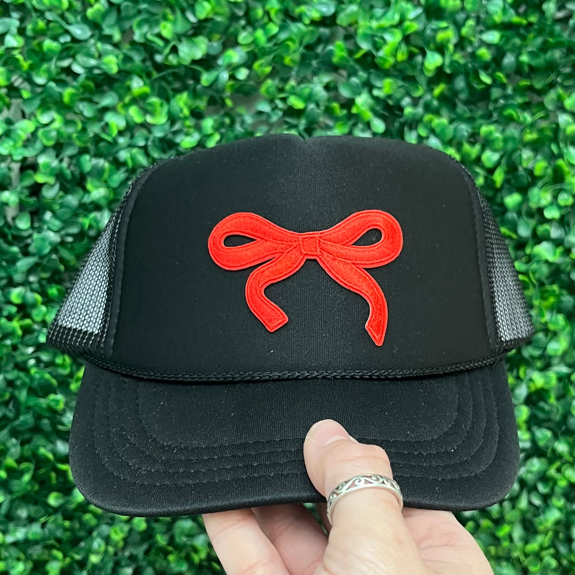 Youth Cutesie Red Bow Puff Trucker Hat • Black
